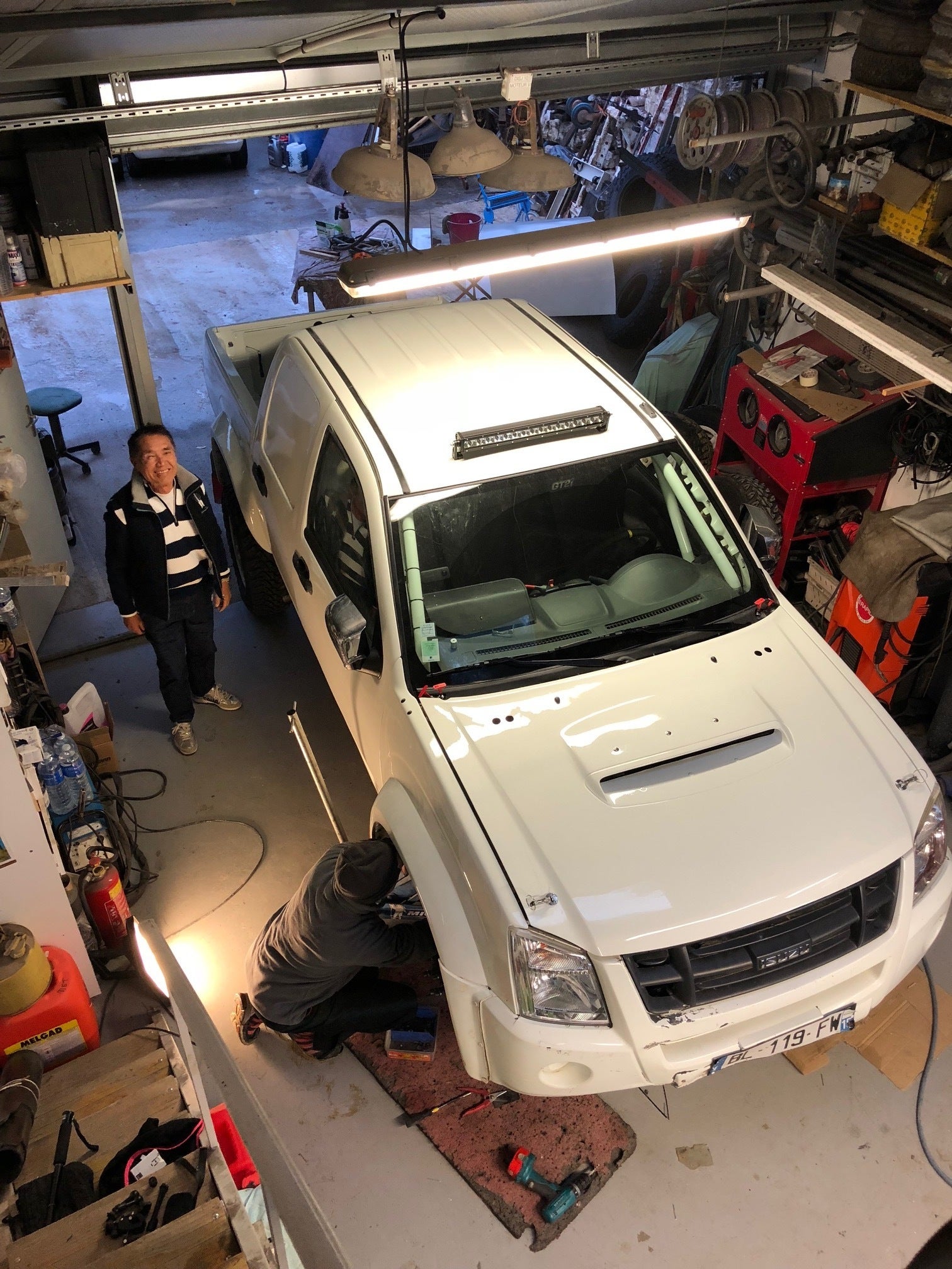 このトラックに3人のメカニックが、修理部品を乗せて走り