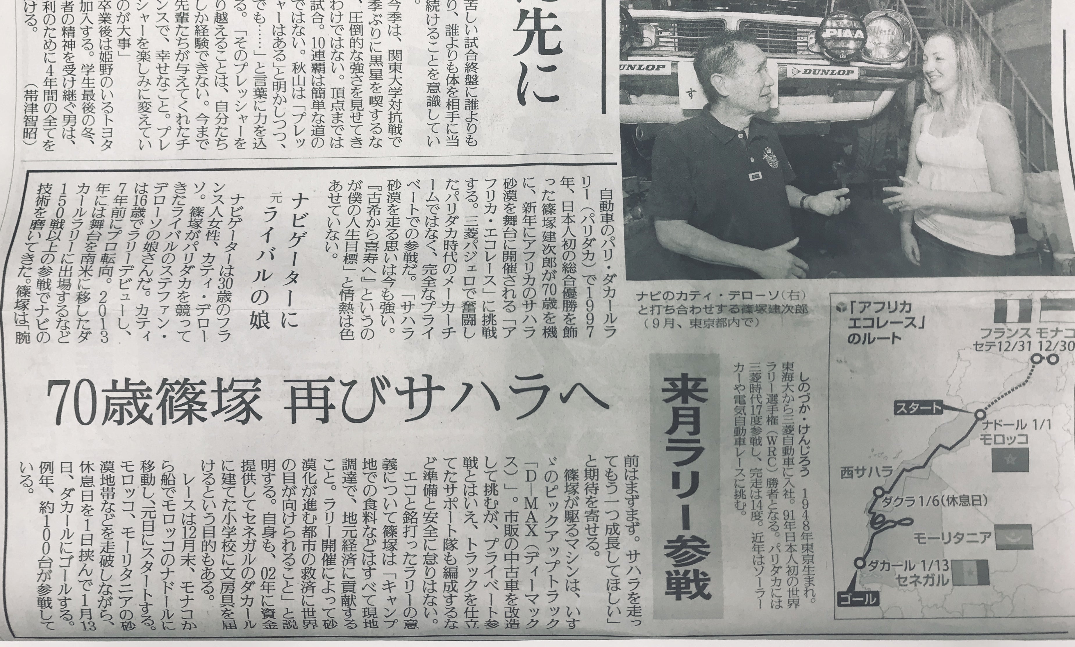 自動車のパリ・ダカールラリー(パリダカ)で1997年、日本人初の総合優勝を飾った篠塚建次郎が70歳を機に、新年にアフリカのサハラ砂漠を舞台に開催される「アフリカ・エコレース」に挑戦する。三菱パジェロで奮闘したパリダカ時代のメーカーチームでなく、完全なプライベートでの参戦だ。「サハラ砂漠を走る思いは今も強い。『古希から喜寿へ』というのが僕の人生目標」と情熱は色褪せていない。