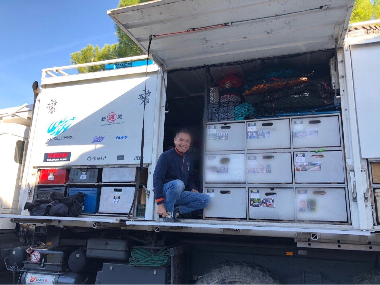 支援者様のお写真と共に、サービストラックは修理部品やメカニックを乗せて