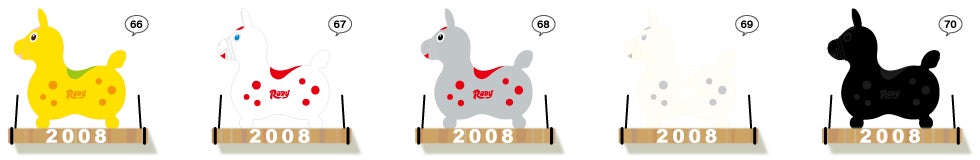 ▼ その後、赤色に続き黄色と青色が増えました。それら三原色は子供の注意をひく主要な色だからです。今では定番色は10色に増え子供の乗用玩具という用途だけではなくインテリア雑貨として子供たちにだけでなく大人たちにも愛されています。