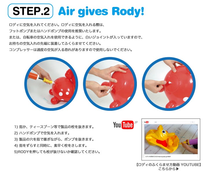 セットの空気いれや、浮き輪などを膨らます空気入れで、ロディを膨らませてから遊びます。