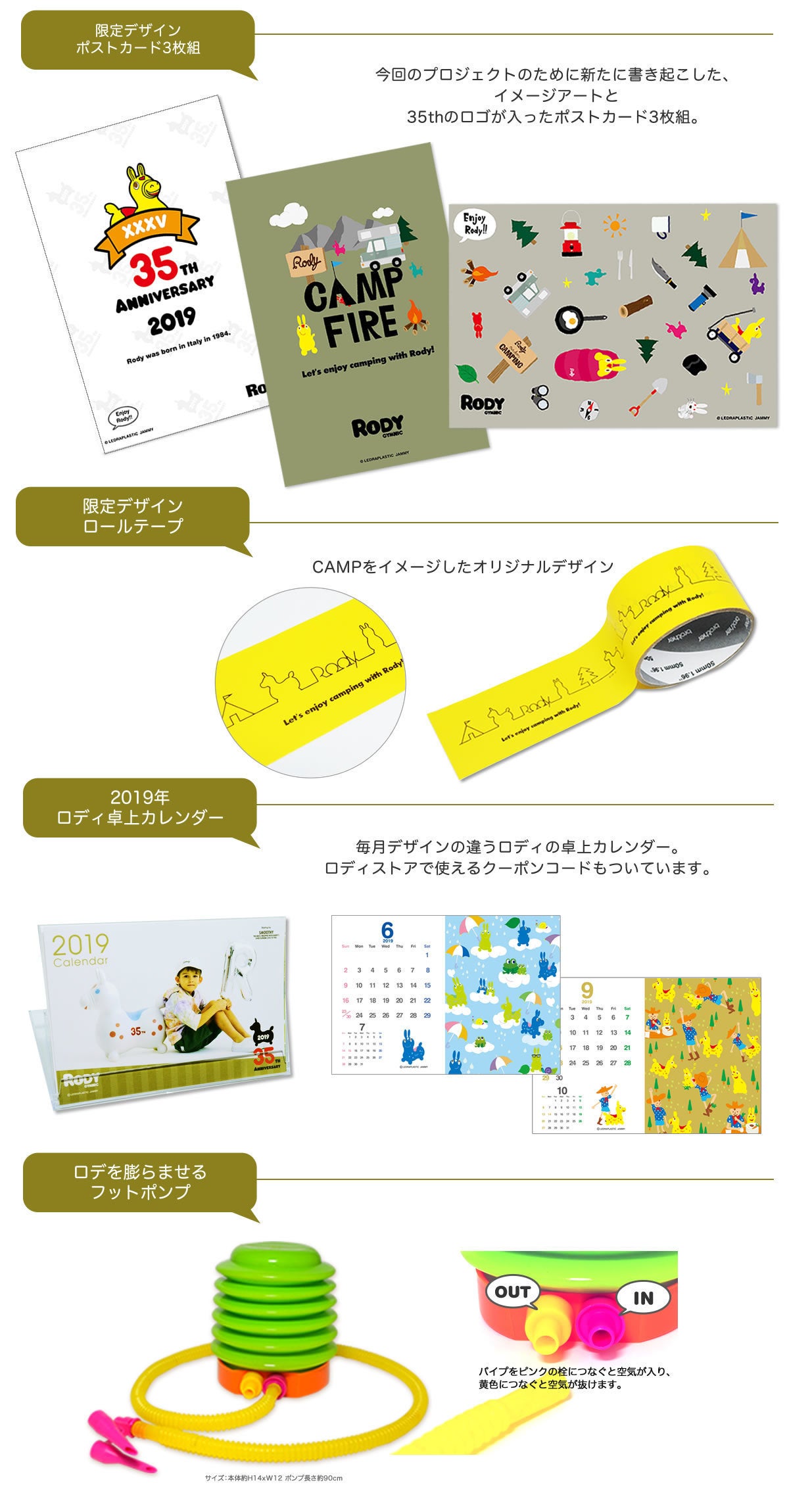 「35周年記念カラー」と直販サイト限定「ロディストア2019年限定カラー」を中心にキャンプファイヤーのみでしか手に入らないグッズもご用意しました。