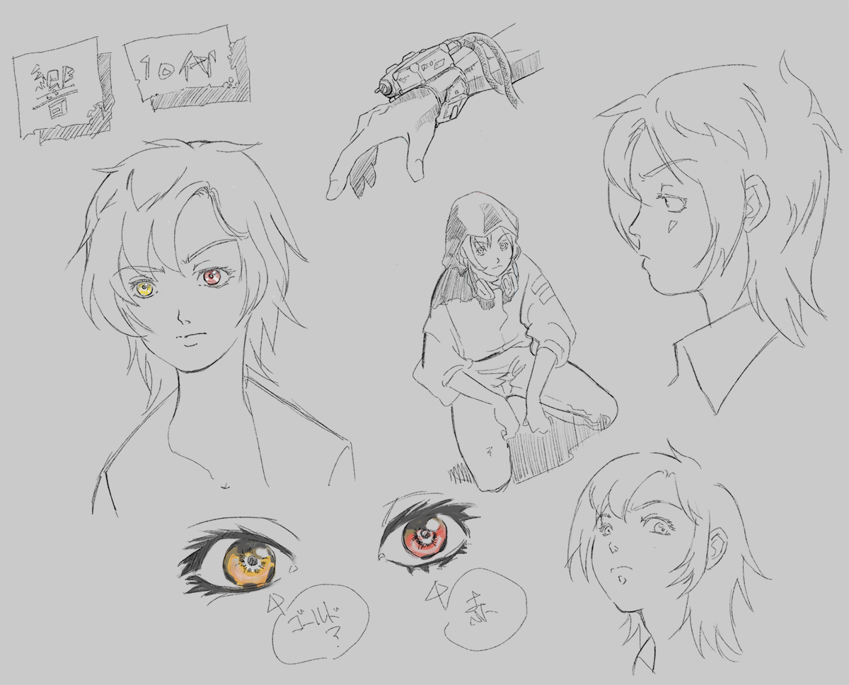 本日の活動報告ですが、リターンの「アートブック」掲載に向けて、準備中のラフ画をお見せします。プレストーリーの主人公・与語響(よご・きょう)のキャラクター設定画です。