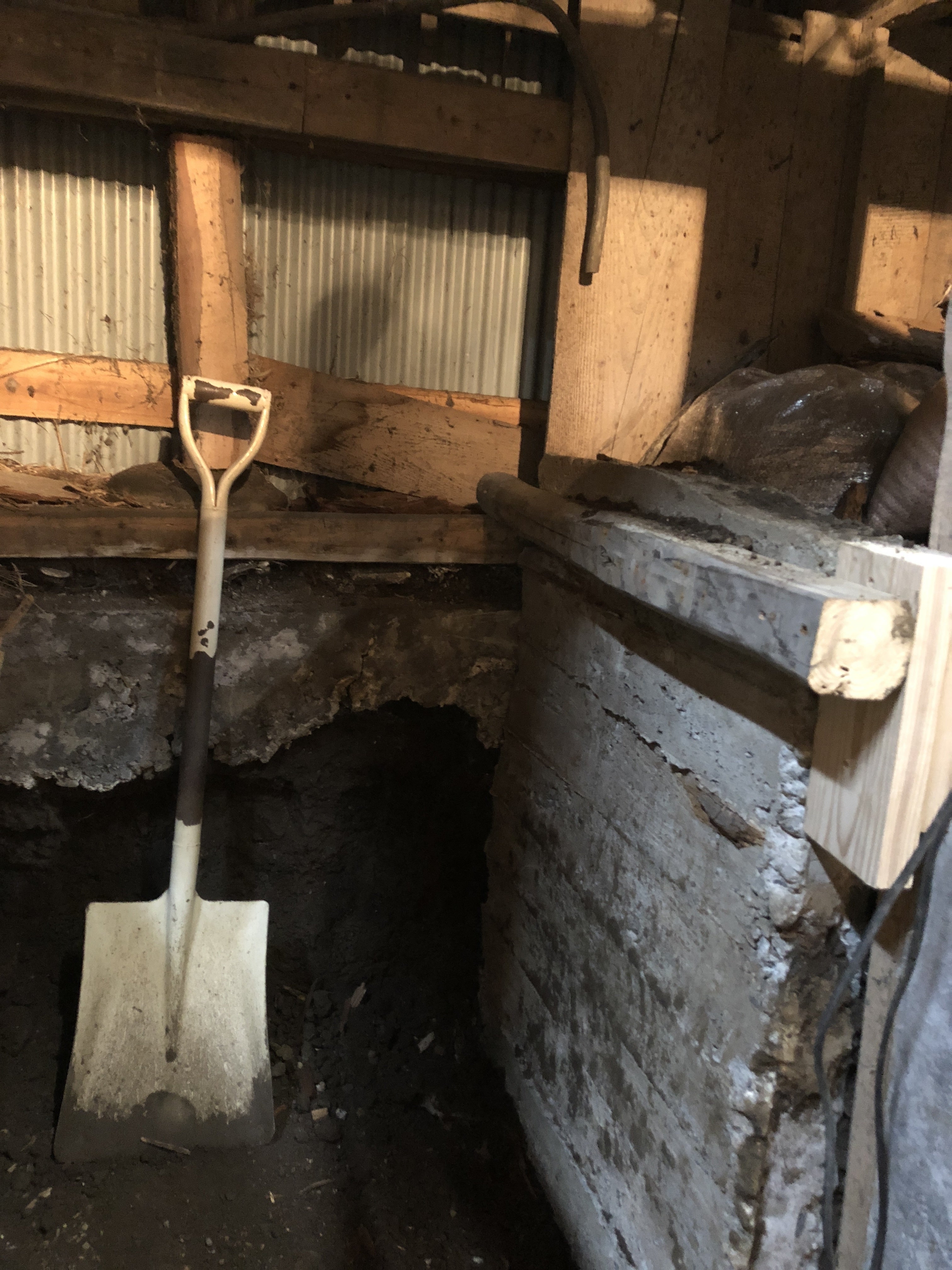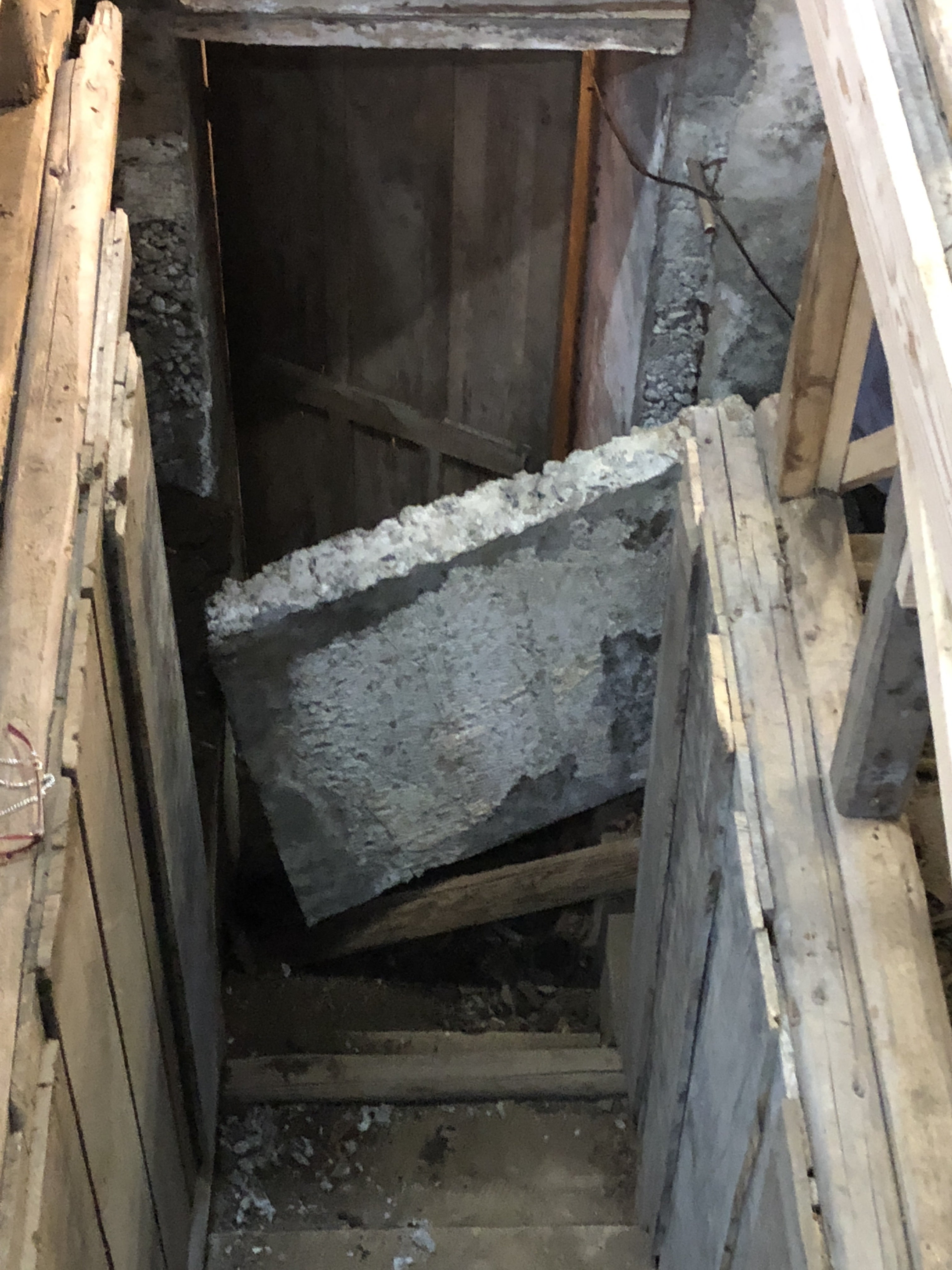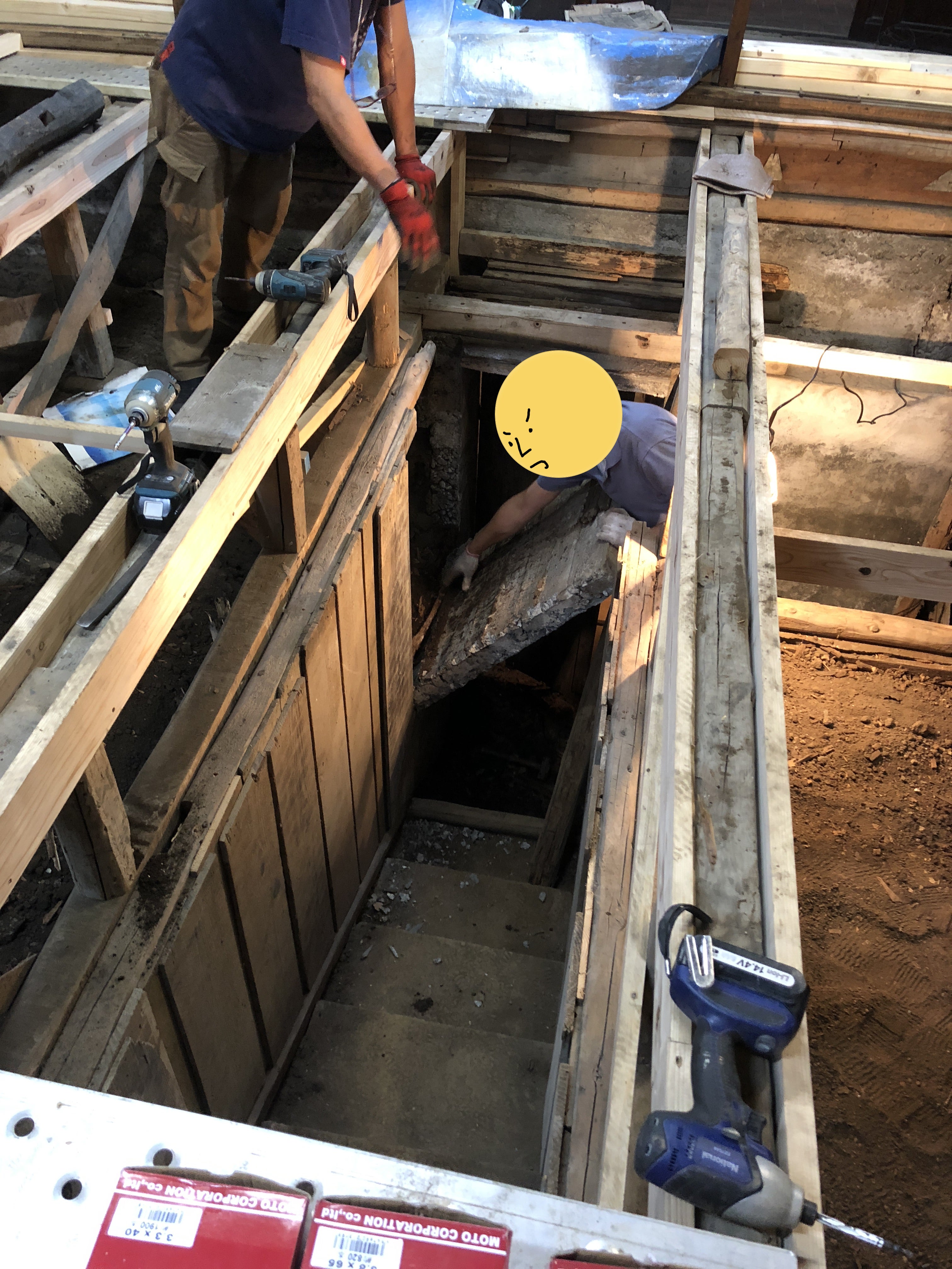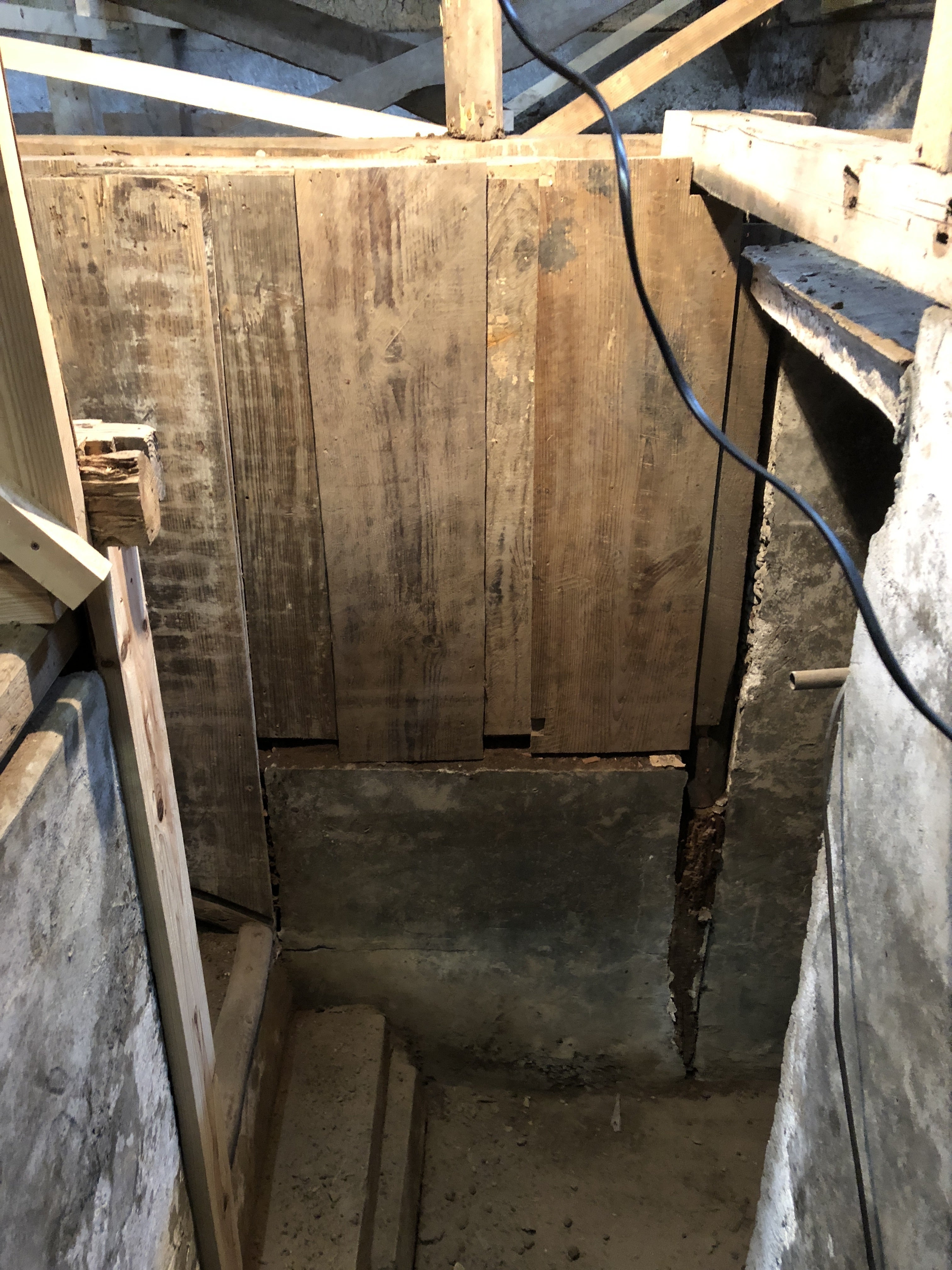 問題の土留めは地下室の入り口を阻むかのように倒れかけている。