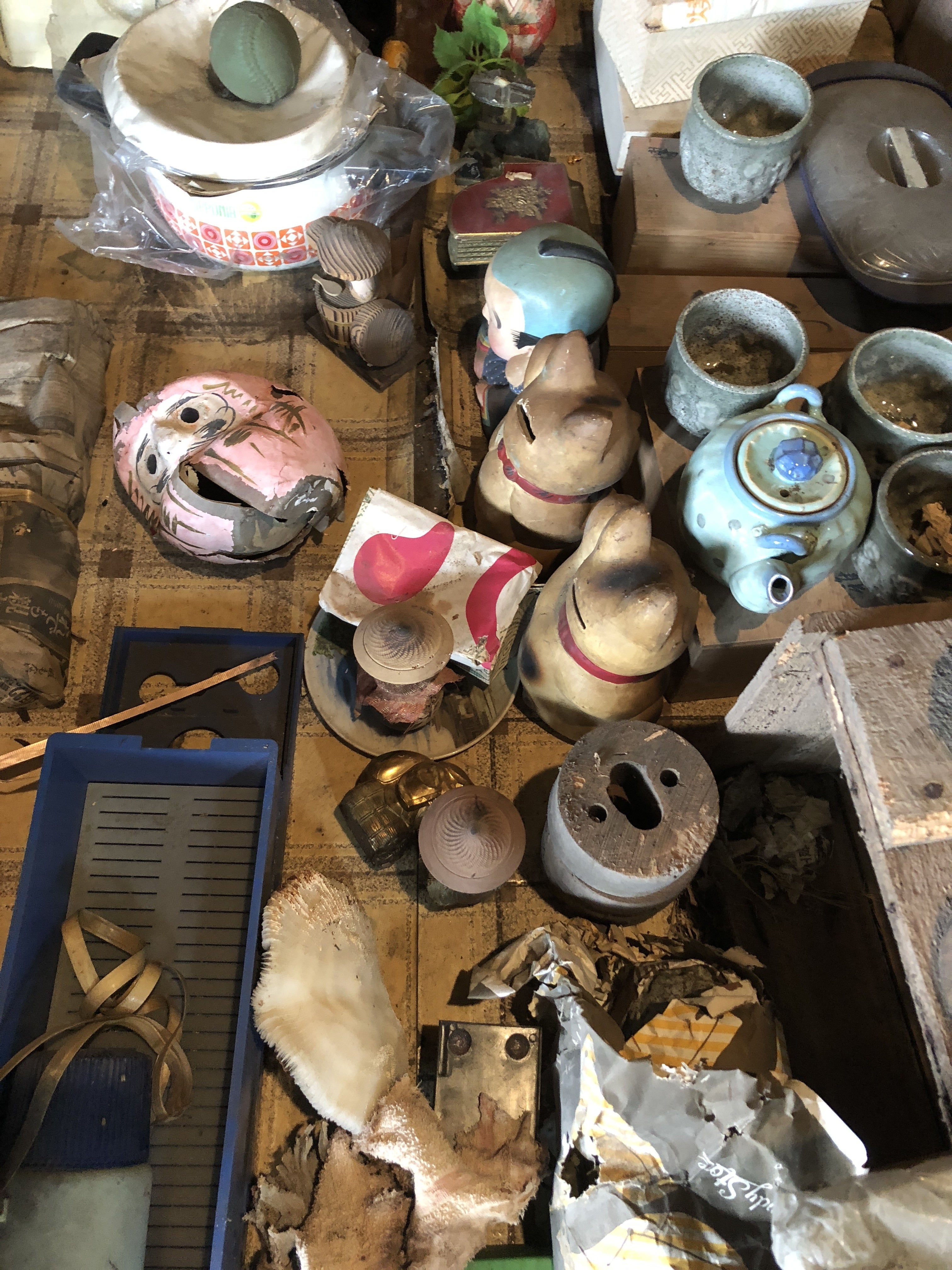 10月19日(金) 地下室への完全勝利とガレージセール 〜前回までのあらすじ〜 たった一人で小さな園芸用のスコップ片手に地下室に挑み 入り口の階段の土を少しかいただけで惨敗した酢平☆。 果たして大工さんが来るまでに地下室の掃除を完了できるのだろうか?! *** 「見学と調査」という名の下、 某ノイジシャンの友人Cがアトリエ(仮)に来ることになった。 8時半頃、友人Cと現場へ到着。 一通りの説明をしたのちCによる地下室の音響チェック。 するとCは地下室を大変気に入り突然即興でライブを始めた。 …今だ!!!! 「金曜日にスコップを入荷する」と言った 金物屋さんへ行きスコップを買う余裕はない。 僕は一世一代のスピードで地下室の土かきを始めた。 真っ暗な地下室でライブに興じる友人を心のお守りにし 園芸用の小さな移植ゴテとちりとりで土をかく。 何が何でも ライブが終わりCが地下室を出ていく前に終わらせたい…!!!! 9時半頃、写真撮影をしてくださるMさんが到着。 Cがライブに興じ、Mさんが地下室の写真を撮っている間に 猛スピードで地下室の廃材を運び出す。 最早一分一秒を争う。 2人が地下室を出る前に全てを完了させたい。 この日はとても寒く、Mさんはマフラーを巻いていたが スピードの鬼と化した僕は半袖で土をかき、廃材を運んでいた。 そしてついに鬼と化した僕は 二人がいてくれたおかげで地下室の掃除を完了させたのだ…!! 僕、やったよ…!大工さん…! (二人のおかげで…!!) その後、未だ地下で音と戯れるCをよそに出土品の開封を行う。 前の住人は几帳面だったのだろうか。 荷物のほとんどが綺麗に箱や袋、新聞紙に包まれ地下に置かれていた。 新聞は1983年の10月21日。 35年前だ。 皿や湯のみ、食器の類が多かった。 明日(2018年10月21日)の午前中から14時頃まで 土間にて出土品のガレージセールを行いますので 興味のある方はぜひ覗きに来てください。 合言葉は「酢平☆いる?」です。 明日は青梅駅すぐの場所でオクトーバーフェストもあるそうなので アトリエ(仮)にもぜひお立ち寄り下さい。