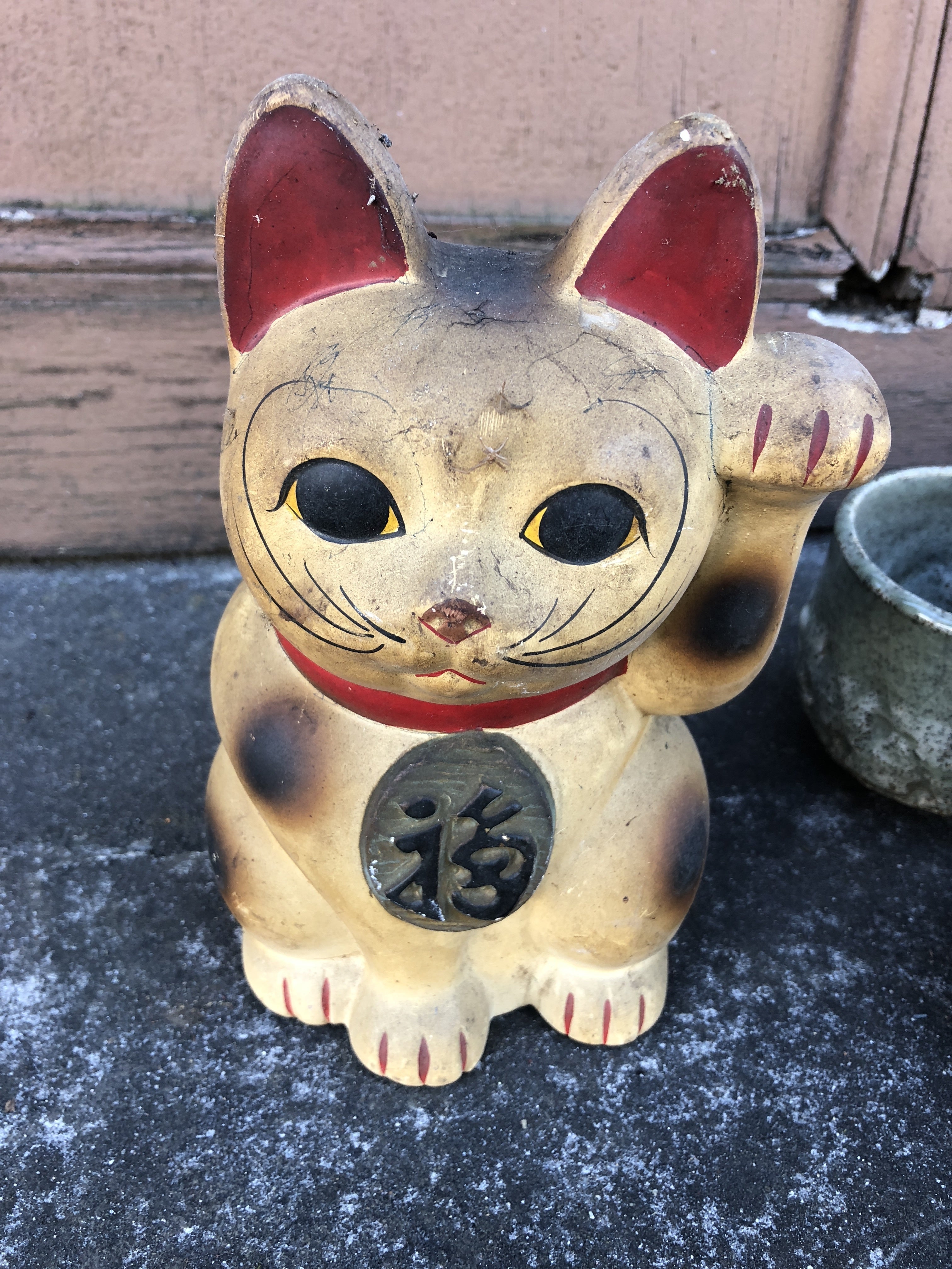 〜楽しいシールコレクション〜 地下室ばかりに目が行きがちだが壁や柱にも注目して欲しい。 えっ、これ何のキャラクター? っていうシールが貼られているのだ。 壁の補修で上から色を塗る予定の場所もある。 今後見られなくなってしまうのでここに記録として残しておく。 「みんな見てるぞ!!」 オープニングシール。 土間の入り口に貼られているコレ。 眉毛が太すぎるよね。 シールで防犯という味わい深い一枚。 キャラクター界のドン・キティ先輩。 大正時代のものではなさそうだが流石先輩、この長屋にも降臨していた。 斜めに貼られているクラシアン。 雑に貼られているのが何とも言えない。 シール上下の朽ち具合が時を感じさせる。 「商売繁盛」! 縁起がいいシール! アトリエも盛り上げていきたいものである。 何かの戦隊モノとロボ。 レンジャーの乗っているバイクのデザインが気になる一枚。 ロボはおなかに「忍」と書かれている。 手塚っぽいキャラクター。 ウランちゃん…かな…? 髪の毛が剛毛そう。 朽ちてる消防シール。 このシールで火の用心を心がけてくれたおかげで 今の長屋があるのだ。 ありがとう消防シール! ファンシーシール。 絵のテイストが実に昭和! TOTOシール。 こんなキャラクターがいたんやね。 無造作に貼られすぎである。 昭和60年代の火災予防シール 犬と思しきキャラクターが描かれている。 こちらも火災予防に役立ってくれたのだろう。 ありがとね。 ブリヂストンとライオンシール。 えっ、ブリヂストンって自転車じゃないの? 調べてみたら1954年から1991年まで液化ガス事業をやっていたらしい。 ライオンシールの絵柄も昭和っぽい。 ウオーリー?シール。 右上に「ウオーリー」と書かれているので検索してみたけど 某しましまのおじさんキャラしか出てこなかった。 何のキャラなんだろね。 酢平☆イチオシの謎シール! 腕を組んだ人とハチ?のシール。 マジで何のキャラなんだ!笑 土間の壁に貼られてるんだけど土間の壁は補修するので このシールはさよならしてしまう予定。 うーん、もったいない!! 消火器のありかを示すシール。 しかしこの矢印の下にあったのは… そう。 地下室! いやいや、昔はちゃんと消火器もあったんだろうけどね。 以上、楽しいシールコレクションでした。 明日(10/23)は午前中のみアトリエ(仮)にいる予定なので、 出土品が見たい方やシールを見たい方は午前中にお願いします。 午後はついに大工さんによる工事が始まるよ! 近隣の方にはご迷惑をおかけしますが宜しくお願い致します!