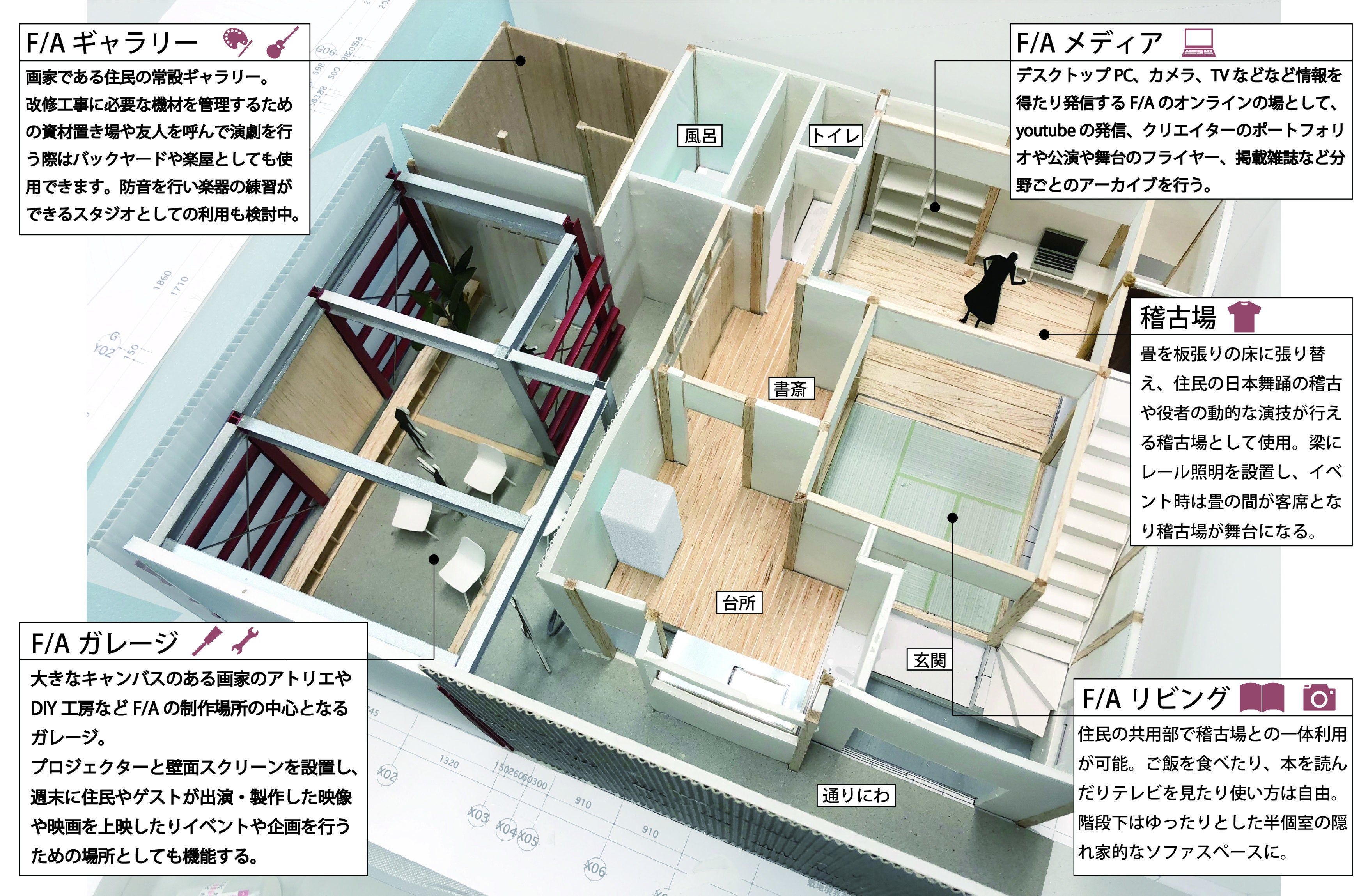 ガレージの内装やリビングの修繕、その他住むための機能を向上させるDIYなど、「F/A House 神楽坂」の整備を住人の手で進め、創作環境、表現環境の拡張を計画しています。