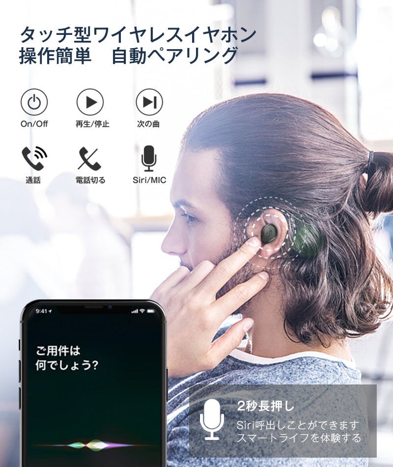 進化したタッチ式bluetoothイヤホン、耳元を軽くタッチするだけで、音楽再生/音量調整/一時停止、通話開始/終了/拒否/次の曲/Siri起動/リダイヤルなどの操作をすべて実現可能。