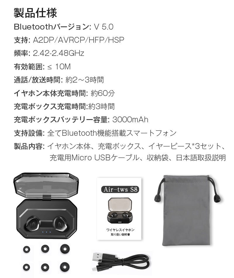 このBluetoothイヤホンが改進版なので、「S8 PLUS 」は両耳で音楽を聴くだけではなく、自動ペアリング、タッチで音量調整でき、両耳通話も対応しております。全分離型Bluetoothイヤホンとして、両耳で使用することはもちろん、単独で使用することも問題ないです。また、IPX7级防水設計により水の侵入を防ぐ、水洗い、汗や水しぶき、急な雨などからイヤホンを守る防水仕様です。