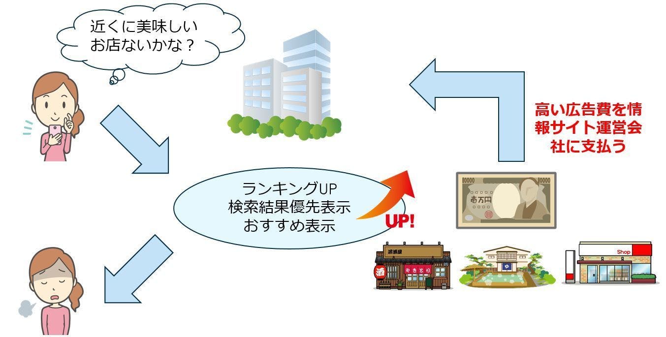 皆さんは、飲食店が探せるサイトを使って、検索して上位に表示されたお店や、おすすめ表示されたお店に行って、このような思いをした事はありませんか?
