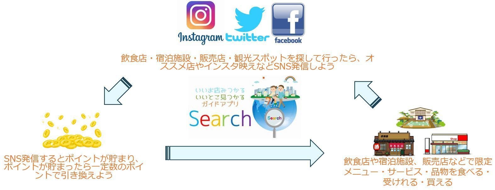 今までやっていた何気ないレビュー・SNS発信が、地方を活性化させ、事業者が抱えるSNS宣伝課題をクリアーにし、自身のSNSフォロワーUP!そして、限定メニューやサービス、品物が食べられる・体験できる・買える、これが私の考えるローカルビジネスレビューサイトの形です。