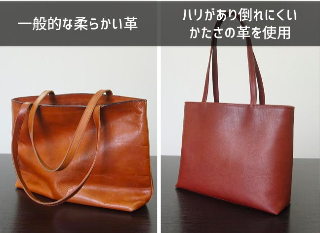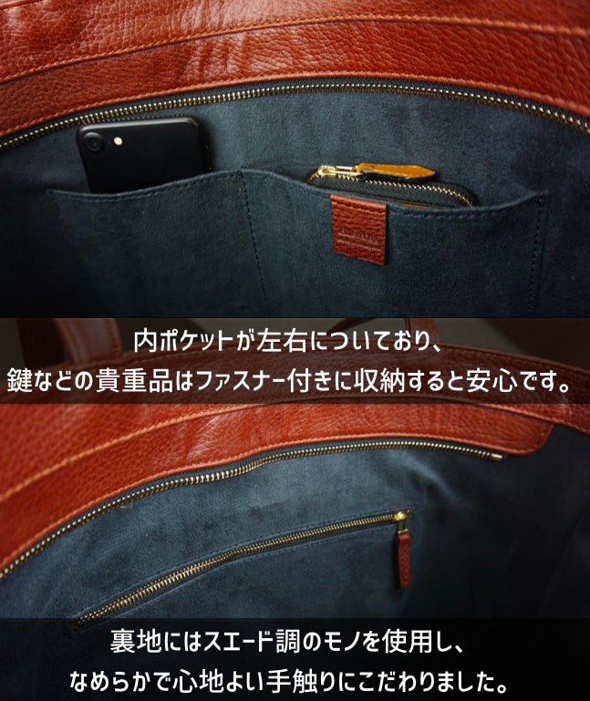 ついつい毎日使ってしまう使いやすさを追求しました。床においた時に出来るだけ倒れないように革の固さにこだわり、バッグに手を入れた時に触れる裏地にはなめらかで手触りの良いスエード調のモノを使用しました。