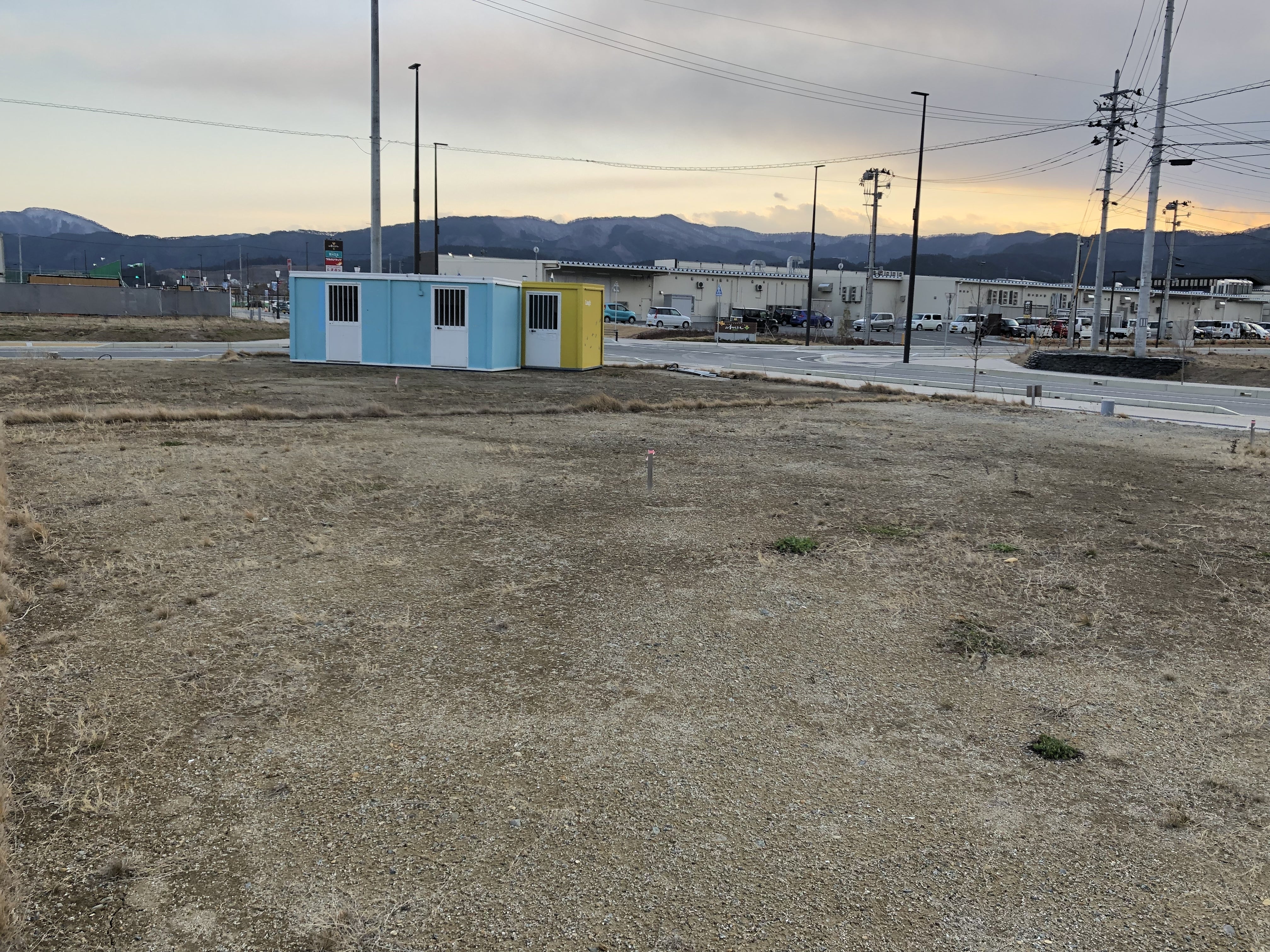だいぶ報告が遅くなり申し訳ございません。4月中に中心市街地にコンテハウス2基を移動しました。更地にポツンと・・・とても寂しい感じです。現在、着工していますので、後日ご報告いたします。