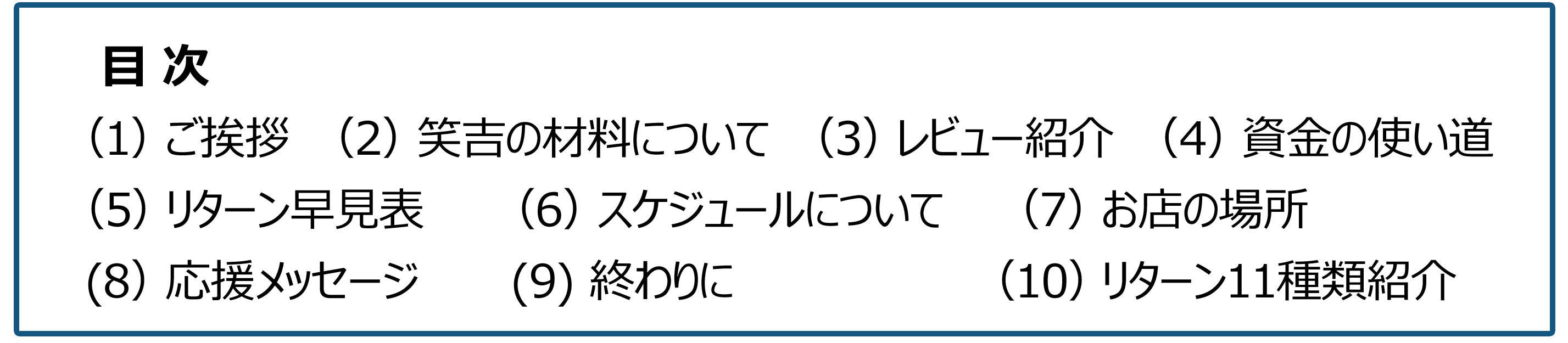 目標達成後は、以下のようなスケジュールで考えております。前倒しできるところはなるべく前倒しをし、早く皆さんの元にリターン開始をさせていただきたく思っております。