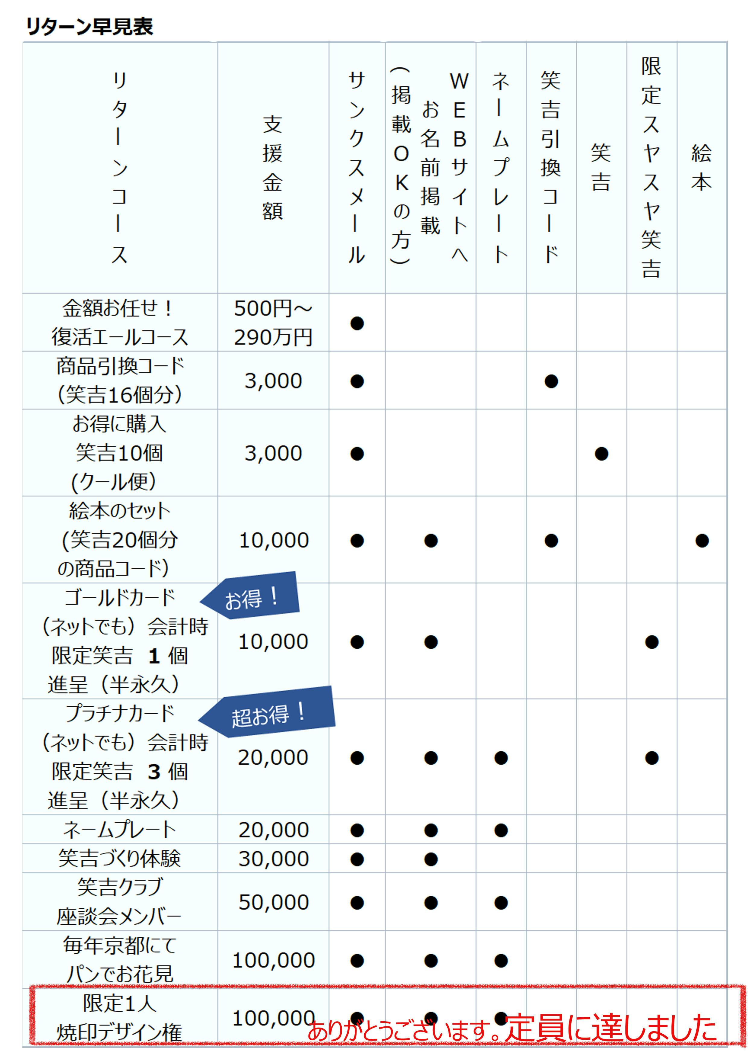 リターンについては、別途ご案内していますが、見やすくまとめた早見表もこちらにご用意しています。