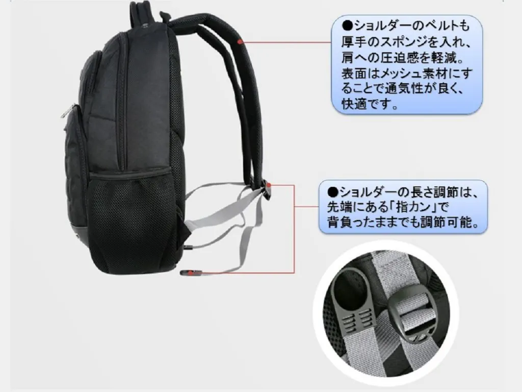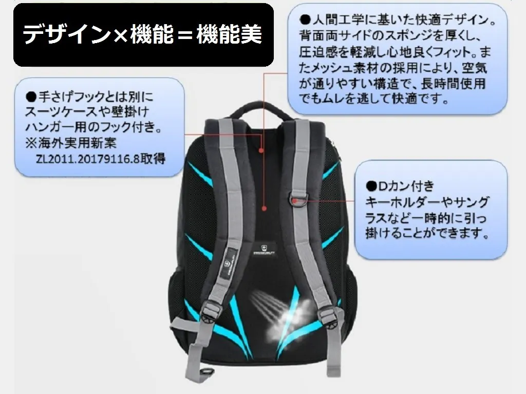 ●人間工学に基づいた「機能美」。高いクッション性とメッシュ構造がムレを防止※背面両サイドに配置した肉厚クッションのフィット感が圧迫感を軽減し、長時間の使用でも疲れにくい。また、クッション及びショルダーベルトの人体への接地面はメッシュ構造でムレ防止。快適さを保ちます。