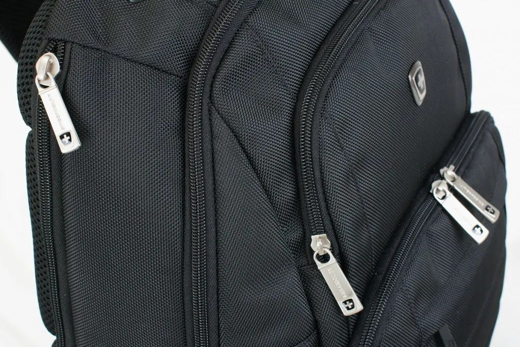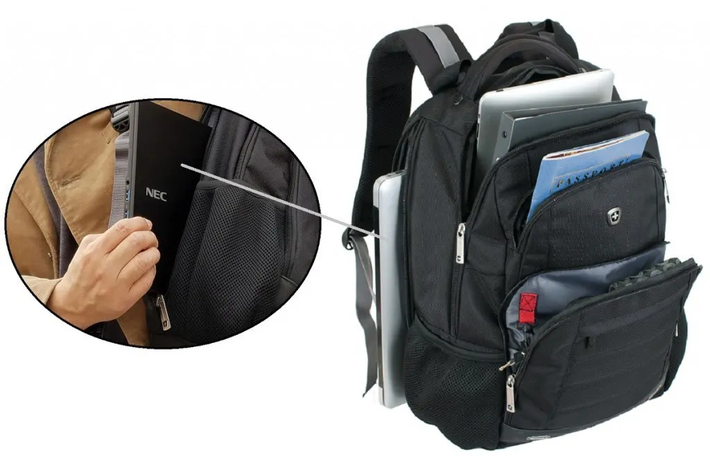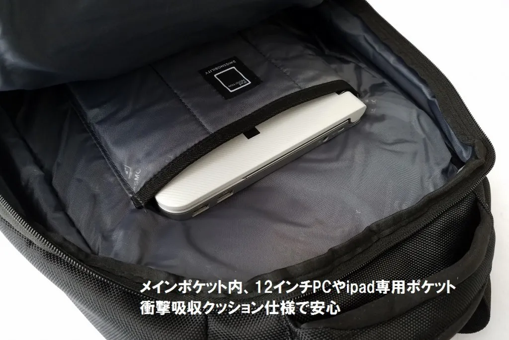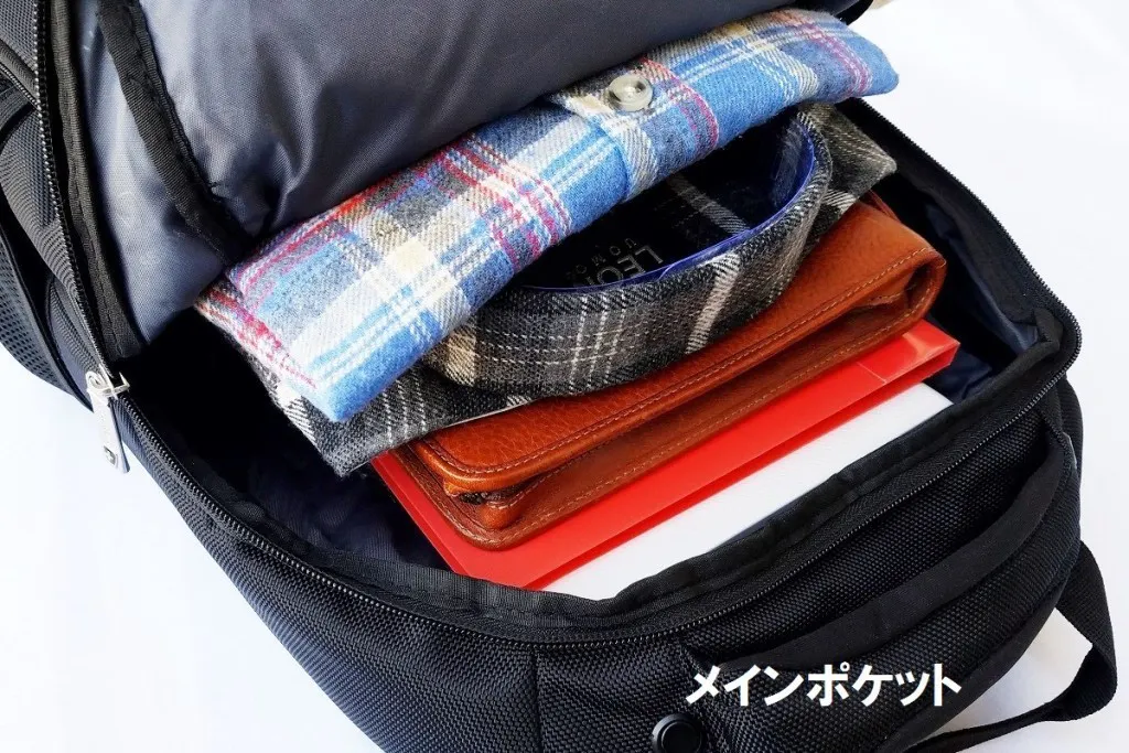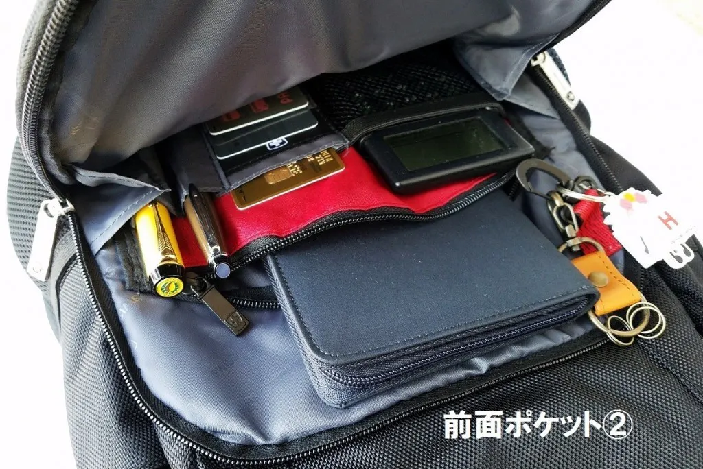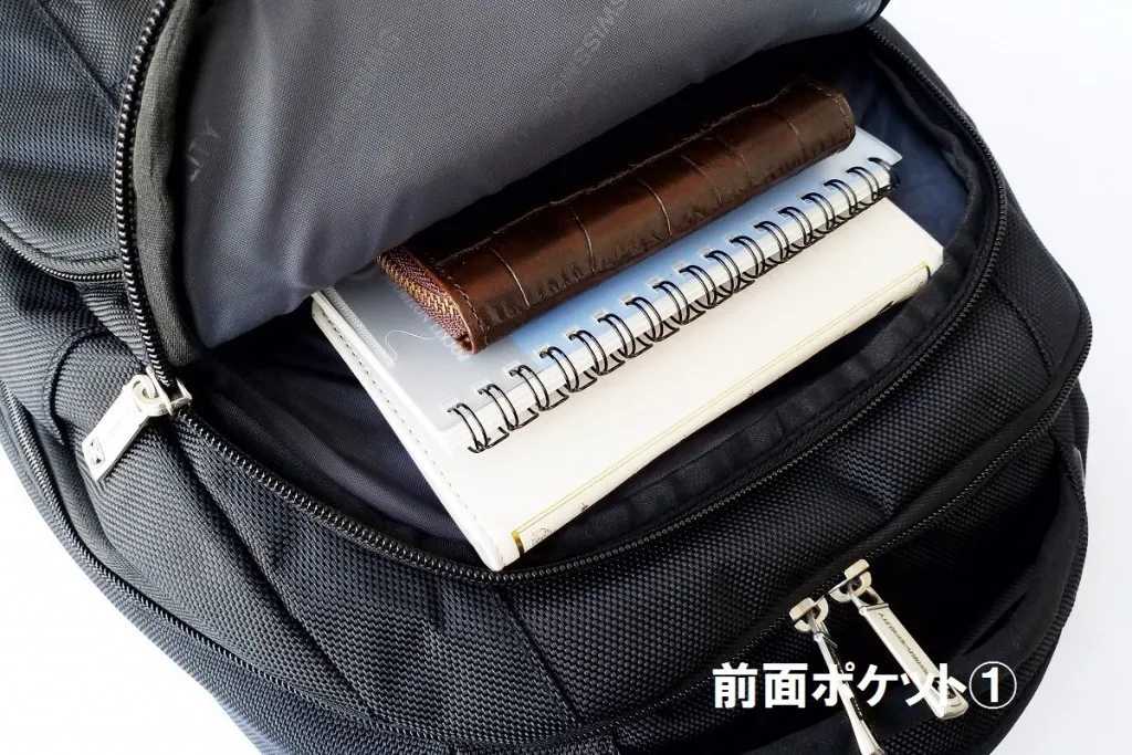 ●前面4つと側面(ノートPC用)のポケットの独立配置によりモノの出し入れがしやすい。ノートPCも肩に下げた状態で取り出せて便利です。