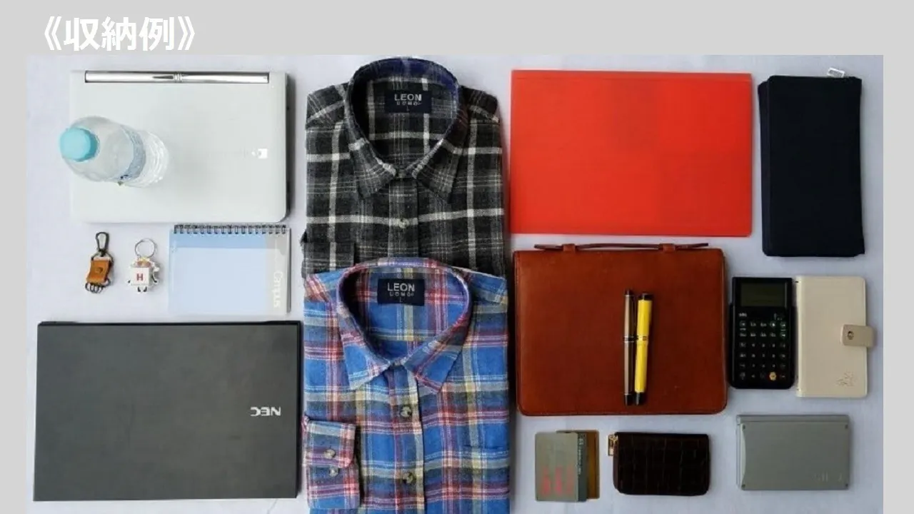 《収納例内訳》①15.6インチPC②12インチPC③A6システム手帳④電卓⑤電子辞書⑥A4名刺ファイル⑦キーホルダー×2⑧B5厚手システムノート⑨本革名刺入れ⑩手帳型スマホケース⑪カード×3⑫ペットボトル500ml⑬Yシャツ×2⑭万年筆×2⑮メモ帳