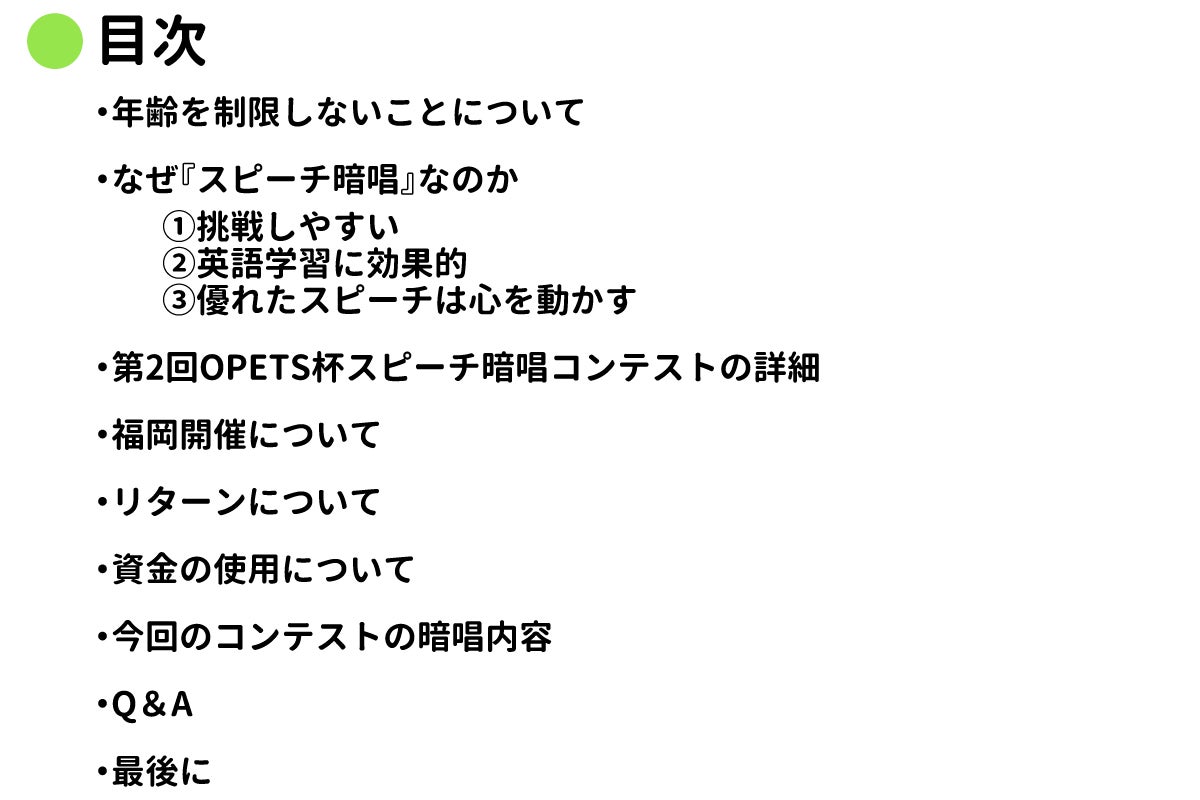 オンライン英会話スクールOPETSがおこなっている『スピーチ暗唱コンテスト対策講座』(通常価格15,000円)を特別価格にてご提供させていただきます。 講座は60分×4回で受講者様とこちらのスタッフとの兼ね合いをみて、11月後半から12月にかけて開講させていただきます。 OPETS特別レッスンの詳細はこちらです。