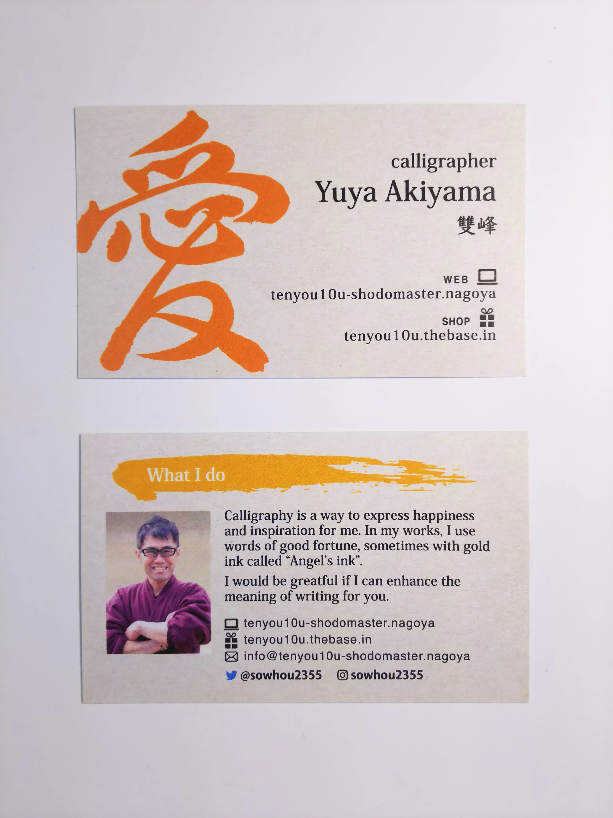 又、私のパーソナルカラーというか、意識している色であるオレンジを基調に『愛』という漢字を入れました。もちろん、私が書いた字を使って頂きました。