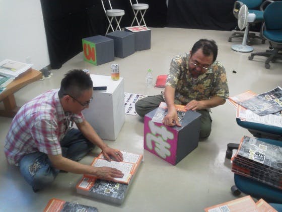 稽古の後、時間のある人には残ってもらって、チラシ折を手伝ってもらいました。二つ折りのチラシ。少しでもお金をかけないように、皆で手折りをしています。