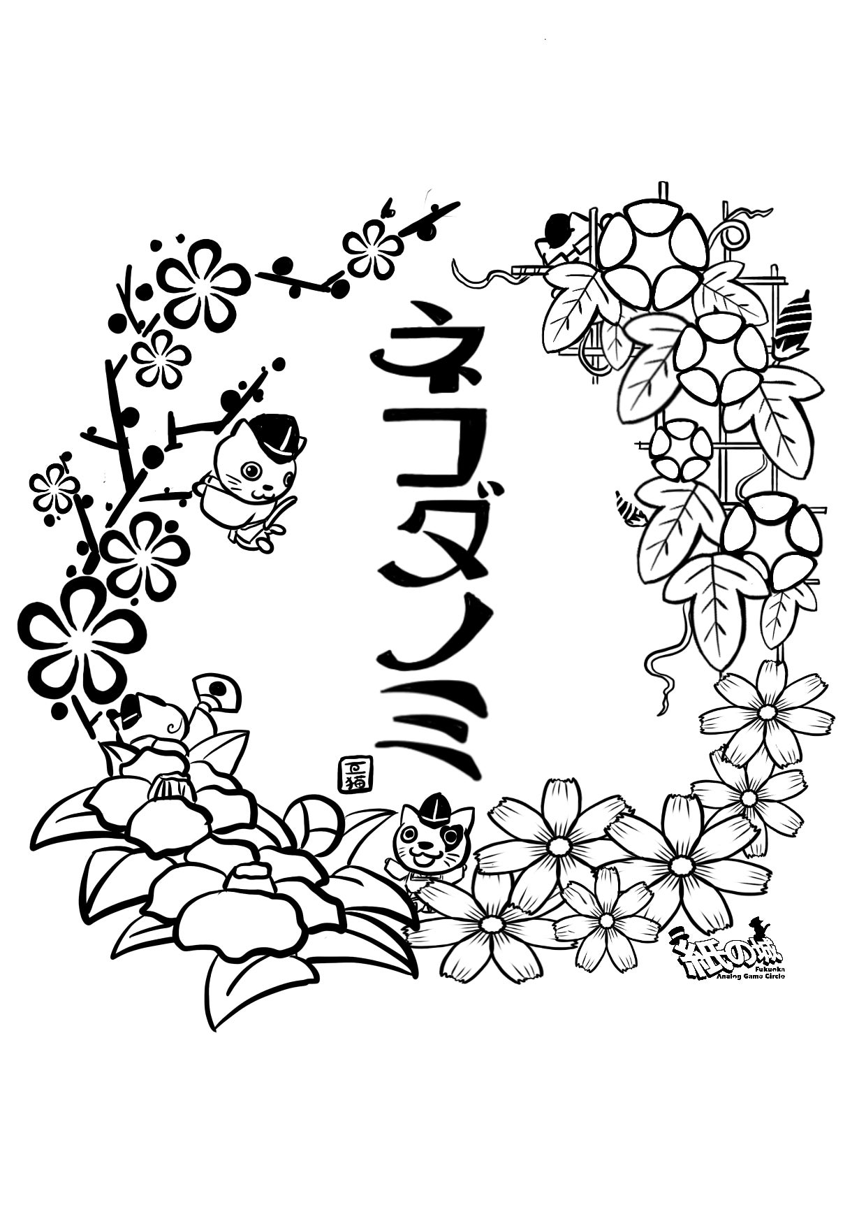 四季を彩った花々の中に六猫たちが紛れ込んだデザインは