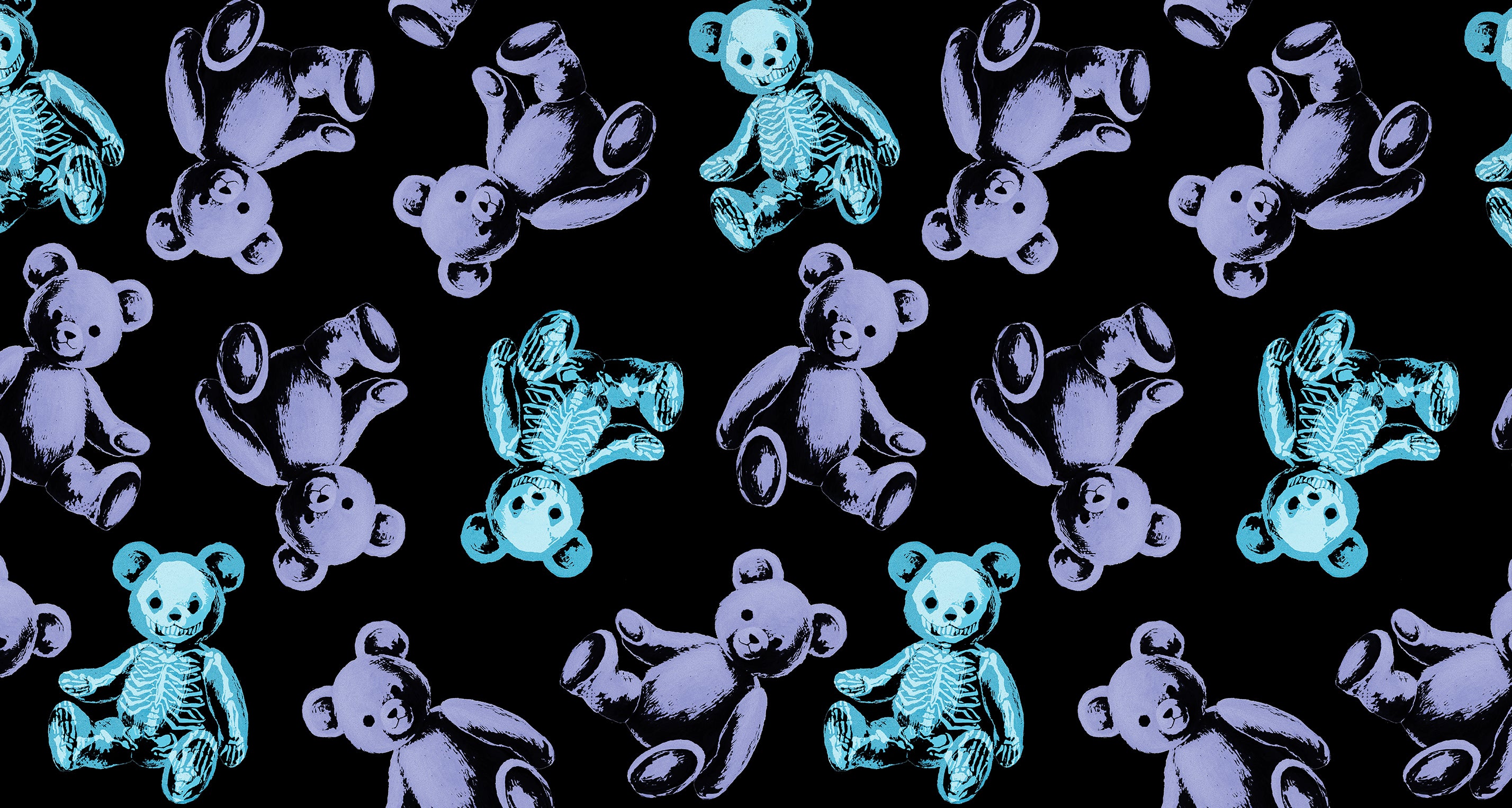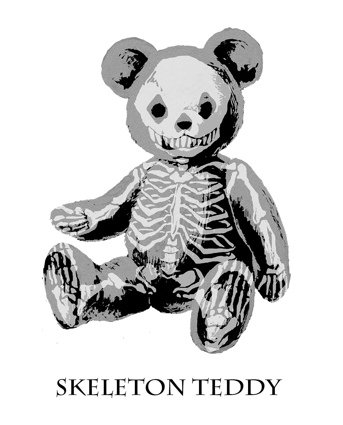 可愛らしいテディベアとリアルな骨の描写のギャップが、愛らしくも恐ろしい。