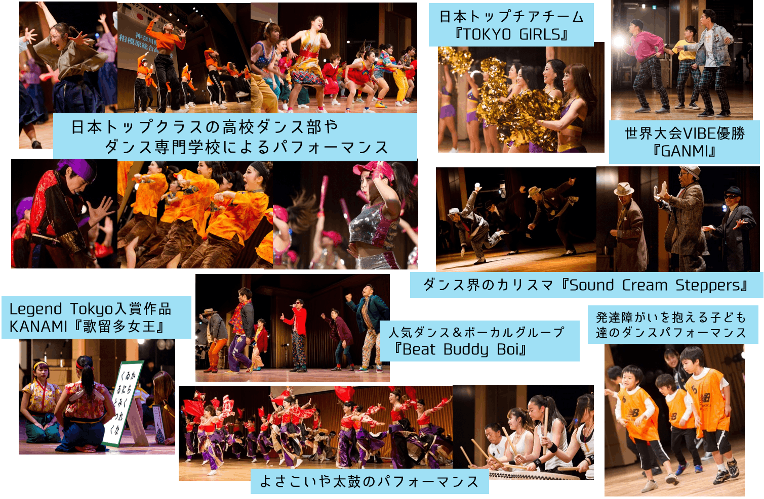 このパフォーマンスタイム、様々なキッズチームの他にも、人気プロダンサーや、日本トップクラスの高校ダンス部、世界大会で優勝しているチーム作品、メディアなどにも引っ張りだこなダンス&ボーカルグループのステージが観られるということもあり毎年大変盛り上がります!