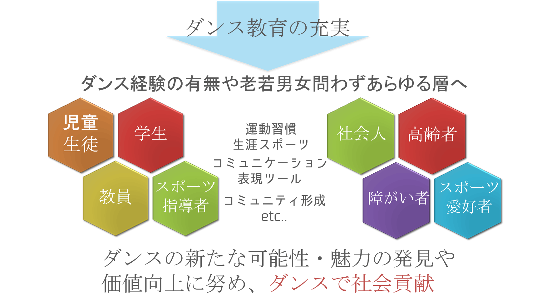 更なるダンスの新たな可能性・魅力の発見や価値向上に努めたい。