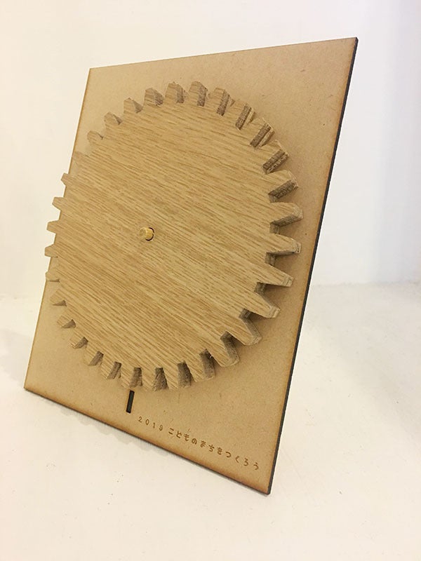 国産家具ブランドで品質にこだわるカリモクが特別につくってくれた天然木突き板の歯車です。支援者のお名前を刻印し、会場内で組み立てれば歯車が噛み合って回り出す光景を作ります。