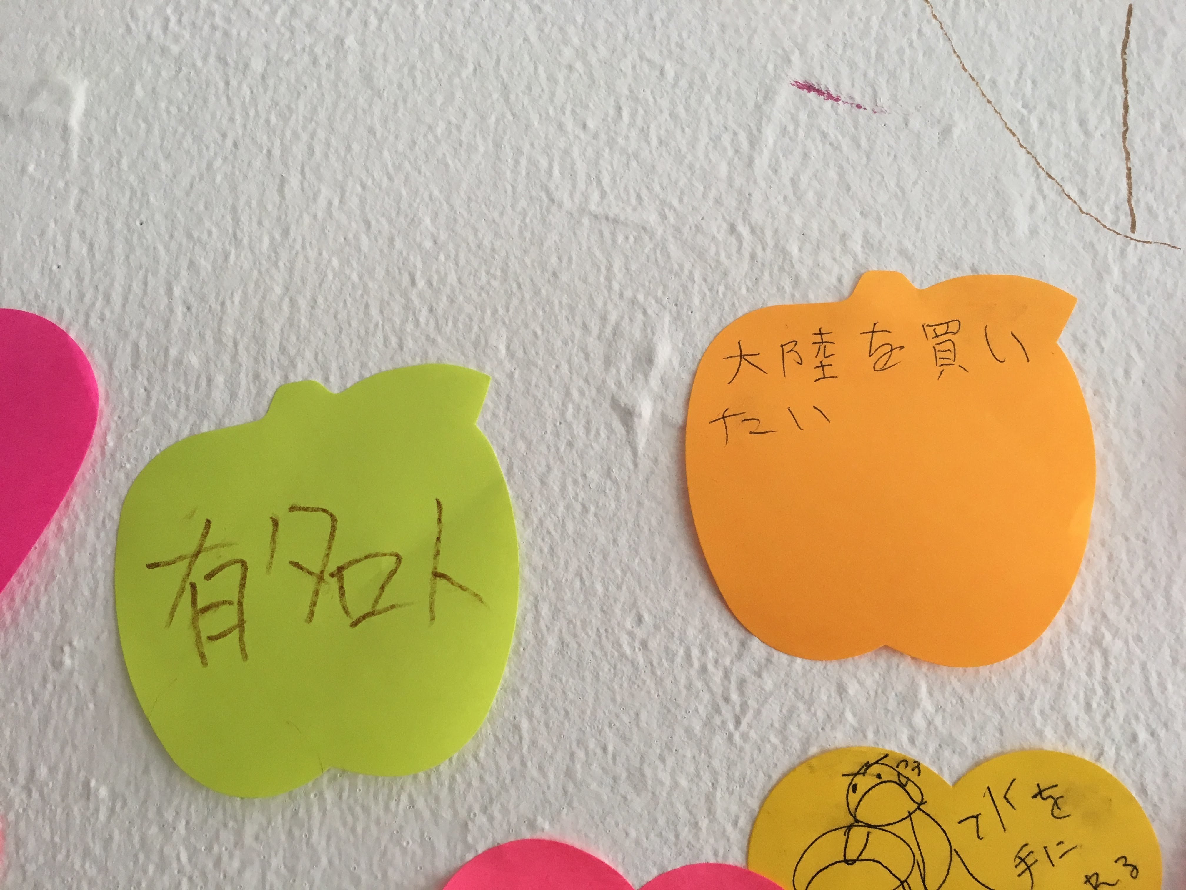 こどものまちで働いたお金の使い途がない、という声が挙がっています。何に使いたいの?と聞くと「家」「土地」「有名人」等の答えが見られました。じゃあ土地と家を買えるようにしようか、ということで”新たなまち”を作ることとなりました。