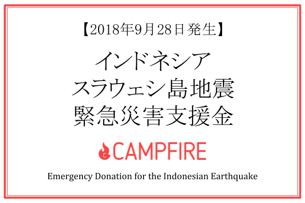 2018년 9월 28일에 발생한 인도네시아 중부 술라웨시섬을 진원으로 하는 지진과 그에 따른 쓰나미로 가옥 붕괴와 연안의 주택 등의 해일 피해가 있습니다. 이 지진 전후에도 빈번히 지진이 일어나, 사상자도 나오고 있어 피해의 확대가 우려됩니다. CAMPFIRE는 재해지나 재해지의 주민들을 돕기 위해 긴급 재해 기부금을 모집하기로 결정했습니다. 모인 기부금은, 자치체의 의연금이나 지원 단체 기부금으로서 재해지에 보내집니다.