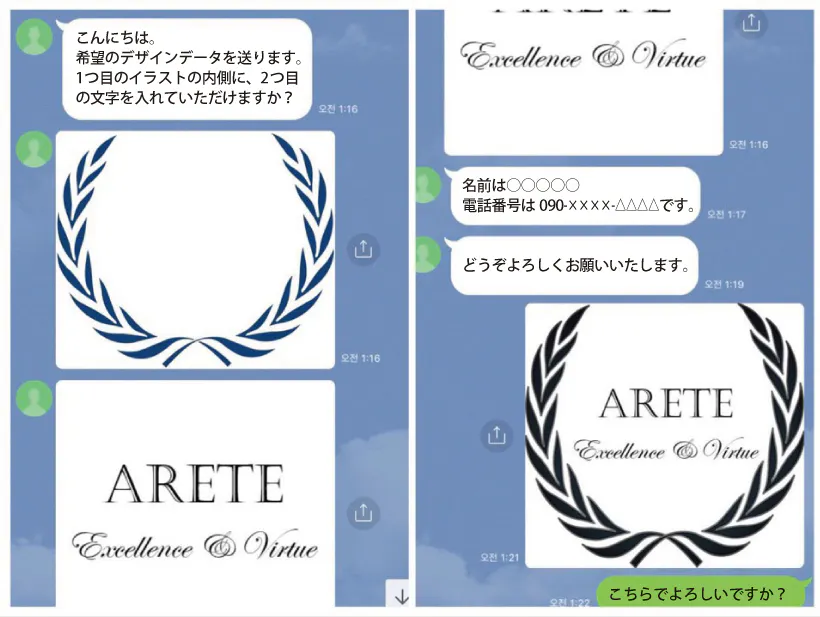 3)スタンプにしたいフォントの名称がわからない場合は、そのフォントの写真を送っていただければ、こちらでご希望に近いデザインデータをお作りし、 LINEまたはメールでお送りいたします。