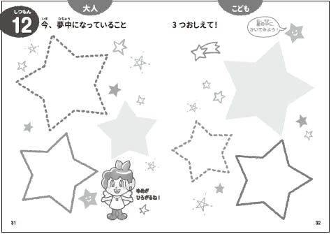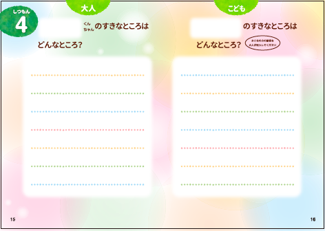 左ページにある問いかけを親御さんが読み、右ページの答えをお子さんが書き込んでいく形式です。