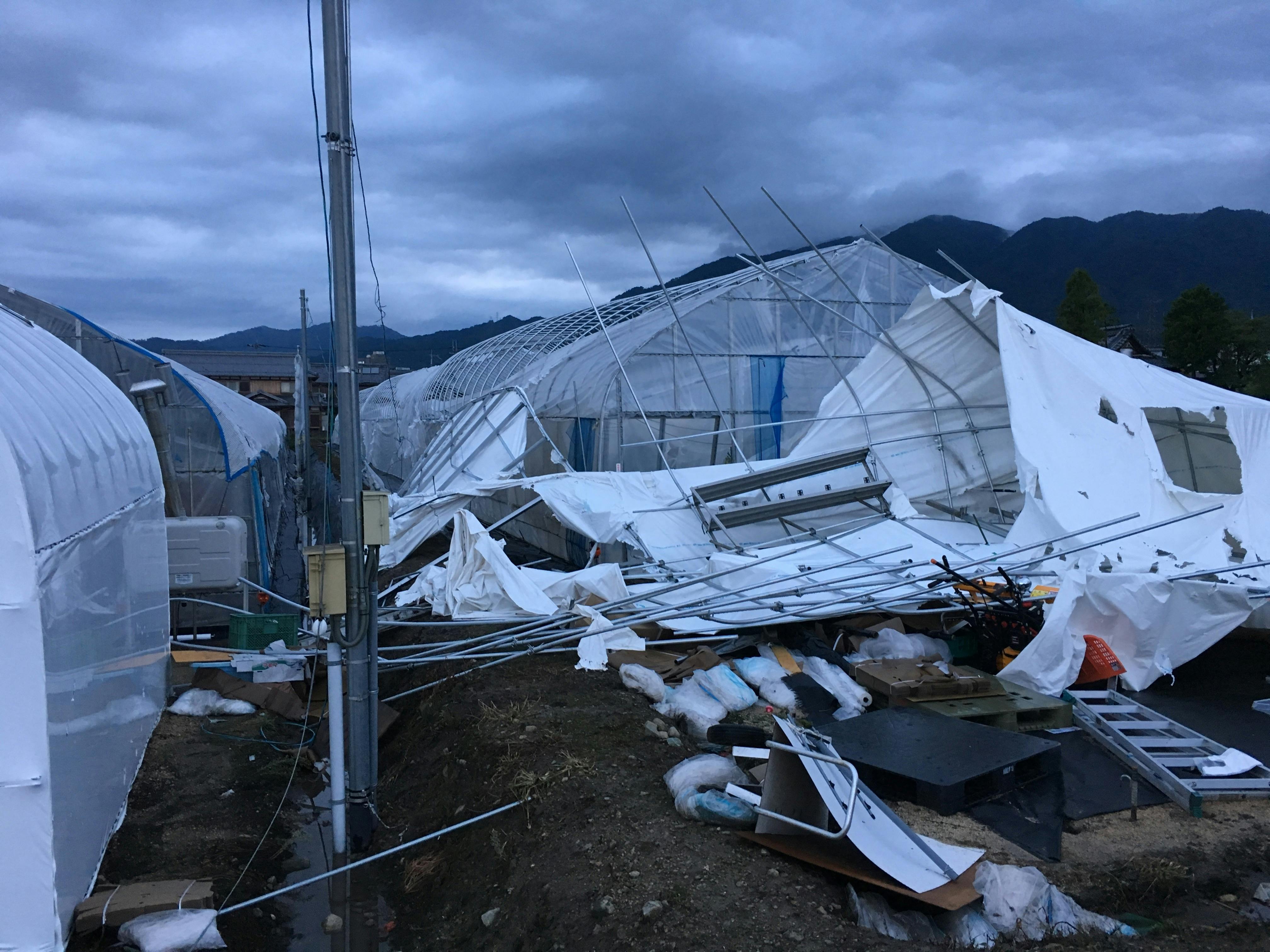 関西空港を水浸しにし、過去最悪の農業被害をもたらした台風24号により私のビニールハウスも甚大な被害を受けました。三つあるビニールハウスのうち2棟が全壊、残る1棟も半壊です。