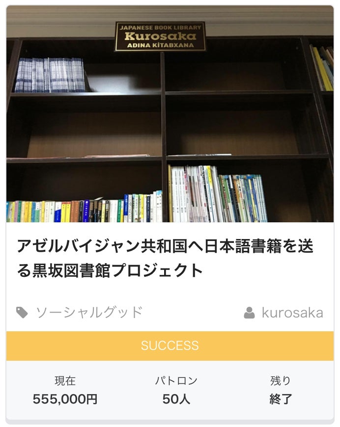 2020/07/14 11:10支援者のみなさまご無沙汰しております、黒坂です。お元気でいらっしゃいますでしょうか?お陰様で私は元気にしております。実は1年以上にわたりアゼルバイジャン政府との交渉を続けて居たのですが、免税での本の輸送(輸出)が完全に無理ということが確定しました。前回の輸送時はOKだったので、今回も簡単に行くと思っていたのですが、大間違いでした。。。これが確定してからお知らせしようと思っていましたが、こんなに遅くなるとは思いもよらず、連絡がかなり(1年半以上)申し訳ありません。そういった事情のために、当初はシルクウェイウエスト航空を使った空輸(輸出)を利用する算段だったのですが、現在違う方法での輸送(恐らく郵便局を利用が濃厚)をすることになりそうです。かなりの冊数(2千冊以上)となるため発送業務を委託する方向で調整を開始しました。とは言え、まだ確定ではありません。9月までには発送を完了したいと思っています。今後ともどうぞよろしくお願いします!黒坂 もっと見る