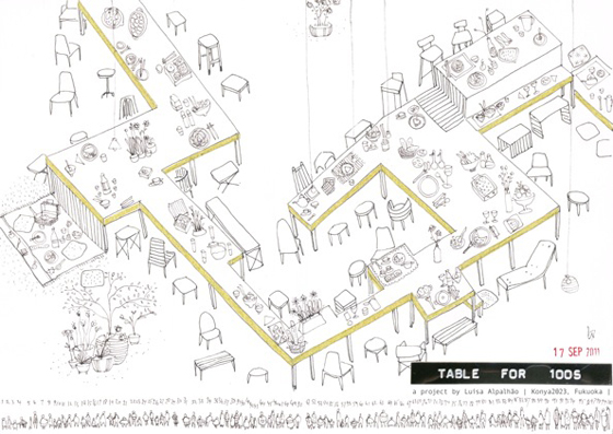 この度は「100人の食卓」プロジェクトにご興味、ご関心いただきましてありがとうございました。展覧会終了後12月に入って、しばらく紺屋に残りながら長崎や阿蘇を観光してきたルイーザ。12月8日、ついに福岡を経ちました。************まだまだ暑さの残る9月。彼女はまず、福岡の食文化をじっくり調査していました。彼女のその詳細なレポートはhttp://tablefor100s.wordpress.com/fieldwork/ (英語)http://konya2023.travelers-project.info/konya-stay/directors/artist-in-residence/ (日本語)で見ることができます。また、子供たちを対象にしたワークショップも何度も開催しています。上記webサイトから成果物の動画も見ることができます。そうしてあっという間に10月に入り、実際に製作する作品の内容の検討に入っていきました。ルイーザとミーティングを重ねていくなかで、日本とポルトガルの活動時間の違いに気づいたり・・・(普段私達とルイーザのミーティングは11時から行っていたのですが、ポルトガルでは11時はまだ朝食の時間とのこと!)ルイーザの作品というと、メインである100人のテーブルが特に目立ちますが、彼女はそれ以外にもたくさんの作品を制作しています。その作業量はとても膨大で、一晩中彼女の部屋の明かりが付いていることも珍しくありませんでした。そうして11月に入り、キャンプファイヤより興味を持っていただいた皆様のご支援の元で、メイン作品の100人のテーブルもつくることが出来、無事晩餐会、そしてオープニングパーティーを迎える事ができました。(彼女はものすごく雨女だと言われていて、実際にこの日も小雨の中の開催になりました笑。)オープニングパーティーの様子はhttp://tablefor100s.wordpress.com/exhibition/http://konya2023.travelers-project.info/2011/11/post-75.htmlにたくさんの写真付きで載っています。やはりメインのテーブルあってのプロジェクトだということを再認識しました。11月30日、展覧会最終日は学生スタッフの提案で、いろんな具を用いた、たこ焼きパーティをしました。オープニングにも来ていただいた方々含め、ルイーザの友達も多く、アットホームな雰囲気のクロージングパーティになりました。http://camp-fire.jp/updates/view/564 (パトロン様限定公開の記事です)************************************************彼女のウェブサイトの日記(http://tablefor100s.wordpress.com/2011/10/26/fieldwork-observations-week-7/ )の最後に、茶室でお点前体験について書かれた以下のような記述があります。彼女の来日中、日本の文化作品制作や生活面において全面的なサポートをしていただいた学生スタッフさんが彼女に送ったメールについて書かれています。一部抜粋します。"I would like to finish this post with ***’s kind email explaining the essence of Japanese Tea Ceremony that should be applied in everything and at all times in life. Dear Luisa,Today’s tea ceremony was good experience for us!and don’t worry about my photograph(^_^)I introduce today’s proverb!‘一期一会 ichi-go ichi-e’一=one 期=opportunity 会=meetmeaning: Treasure every meeting, for it will never recur. a once-in-a-lifetime chance.This proverb originates from 茶道(tea ceremony).It suggests that it is wonderful for us(tea ceremony’s organizer and gests) to meet on the day in a our life,so we should cordially(magokoro!) do tea ceremony every time. I think that it is good word.All people who we met at this project are also 一期一会!! See you on Friday"(一部個人名など省略しています)ルイーザにとってだけではなく、私たちにとっても、ご支援頂いたみなさま、そして、記事を読んで興味を持っていただいた方々、全ての人が、この「100人の食卓」プロジェクトとの「一期一会」だったのかなと思っております。改めて、多大なご関心及びご支援に御礼申し上げます。このプロジェクトとの一期一会を通して、今後のルイーザと私達の活動を引き続き見守って頂けると嬉しいです。本当にありがとうございました!