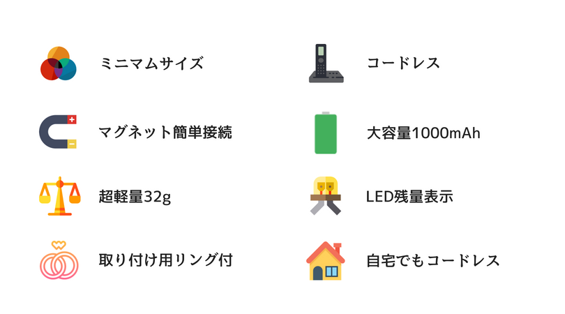 ポケットに入れても気にならないサイズに加え、ケーブル不要、重さ32gという軽さ、そしてマグネット接続という充電したい時にサッと充電することができる、今までにないタイプの充電器です。