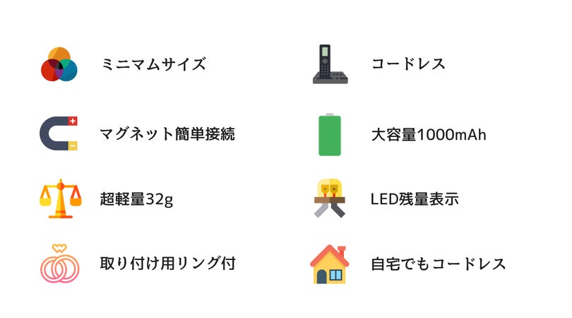 ポケットに入れても気にならないサイズに加え、ケーブル不要、重さ32gという軽さ、そしてマグネット接続という充電したい時にサッと充電することができる、今までにないタイプの充電器です。