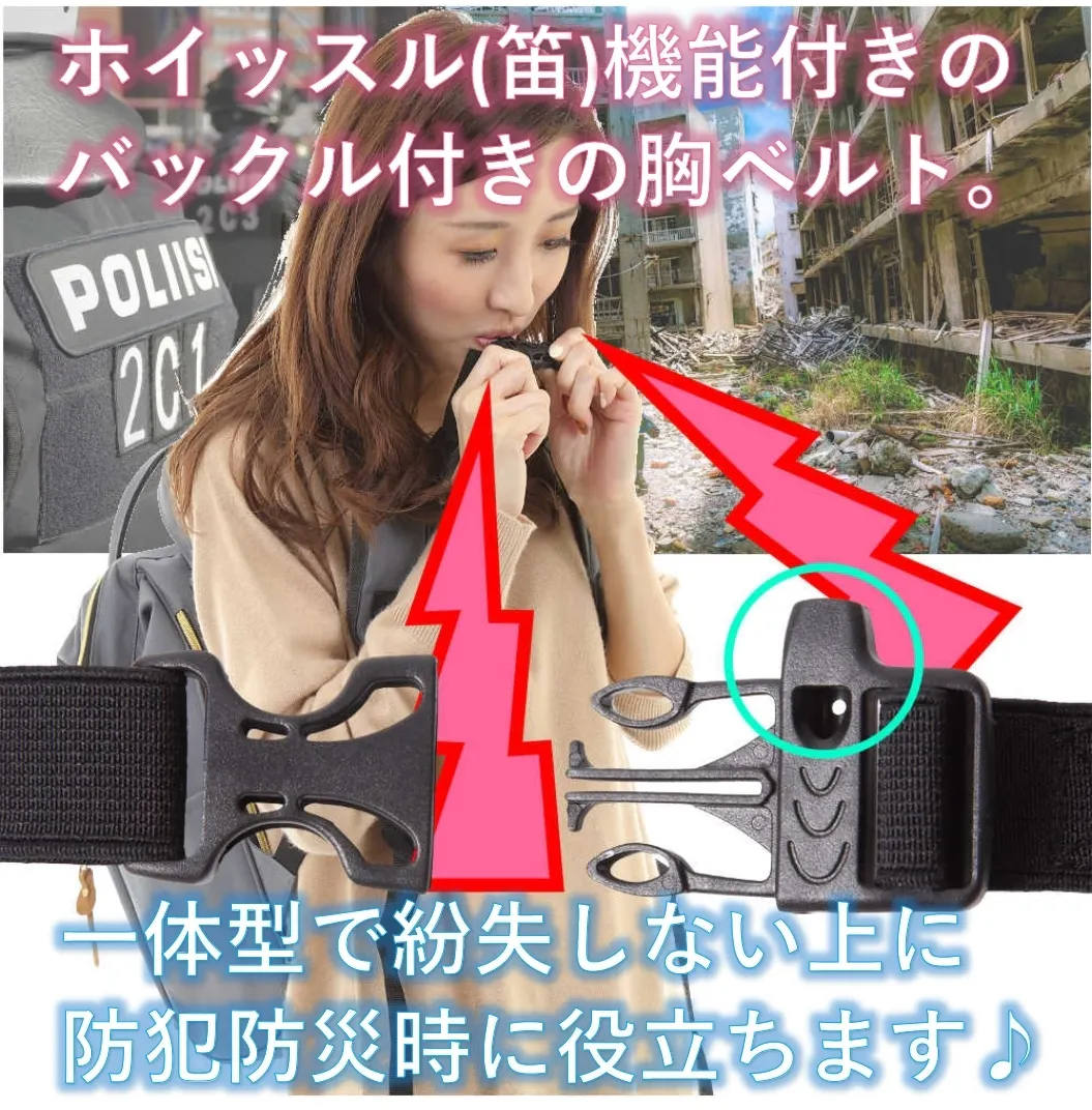 左右の胸ベルトを連結するだけのバックルと違って、ここにホイッスル(笛)機能を追加しました。
