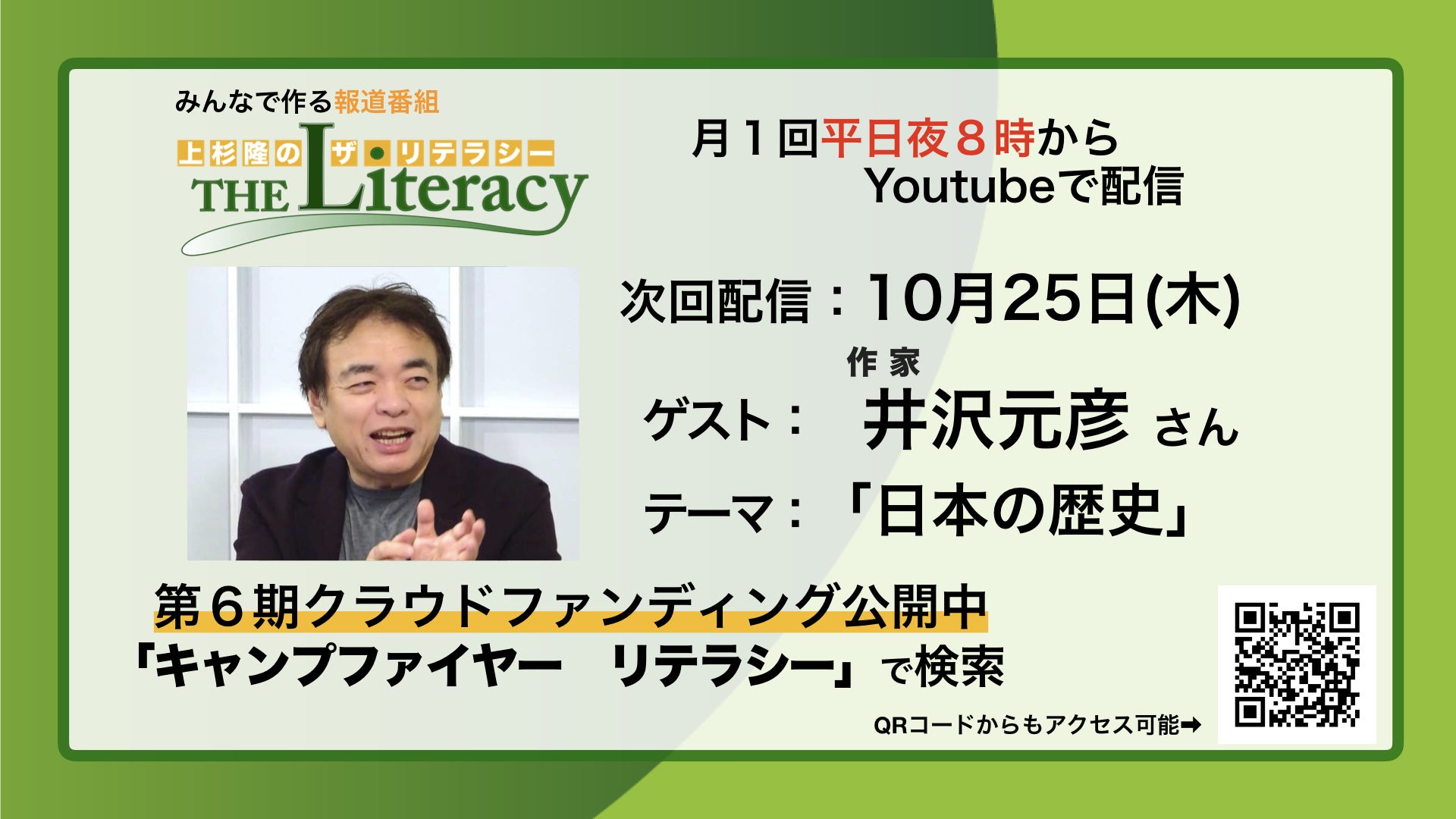 番組前半(30分)は公開配信になります。後半は「ザ・リテラシー」(6期)にご支援を賜りましたパトロン様限定配信となります。限定配信のお知らせは「活動報告」欄でパトロン様限定公開にてお知らせいたします。