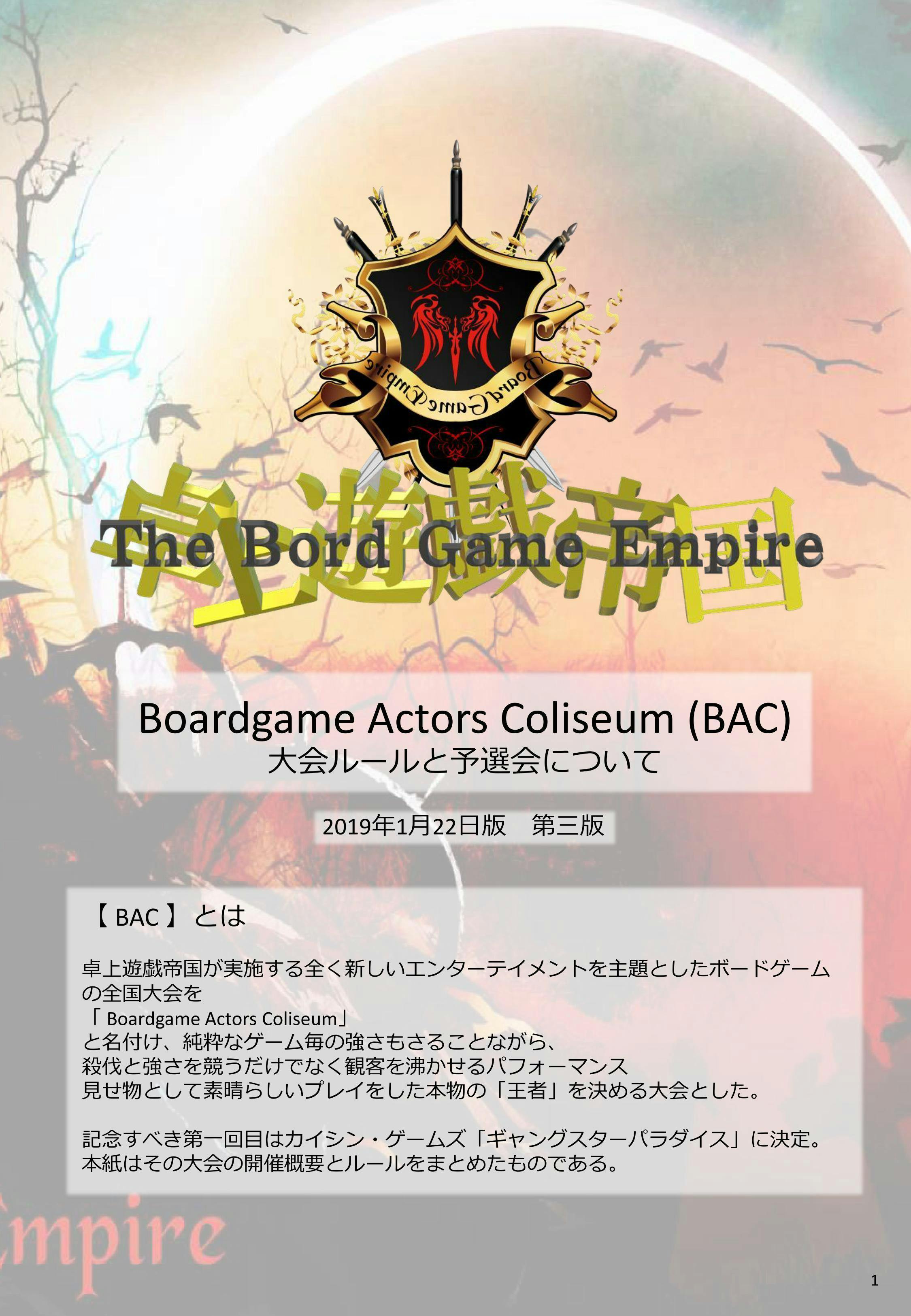 上記全国大会を「Boardgame Actors Coliseum」と名付け、純粋なゲーム毎の強さもさることながら、殺伐と強さを競うだけでなく観客を沸かせるパフォーマンス・見世物として素晴らしいプレイをした本物の「王者」を決める大会とした。