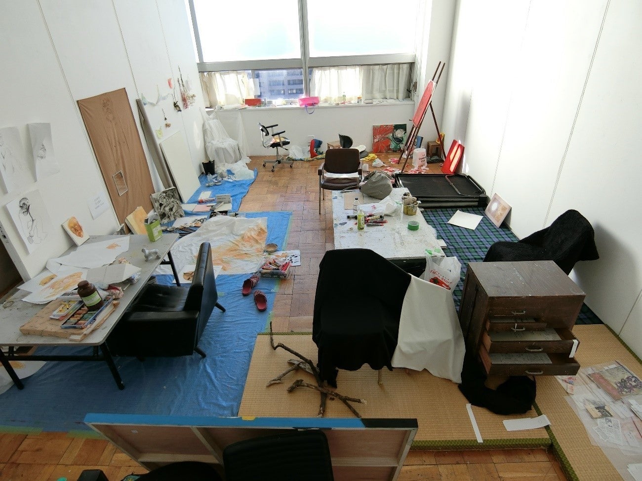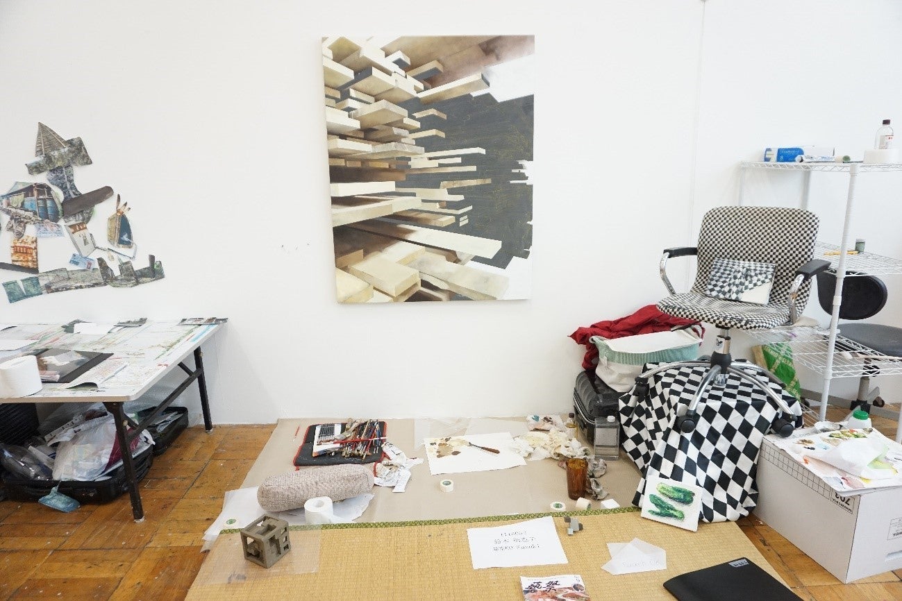 アーティストの実際の創作現場を見たことはあるでしょうか。アトリエに並ぶ使い込まれた道具や資料の山、趣味で集めたアイテムなどを栄養源にして作品は生まれてきます。私たち東京藝術大学絵画科油画専攻3年生のアトリエは、1部屋平均10人という密度で運営されており、この隣近所が近接するなかで制作が行われる現場は、独特の迫力を持っています。本展覧会ではこのアトリエを作品と共にホワイトキューブ内に出現させます。