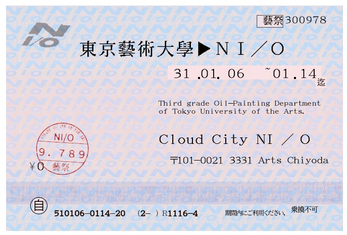 2019/01/10 15:19多くの方々のご支援を賜り、展覧会「NI/O」は今月6日から無事、開催しております。アーツ千代田3331の会場では、現時点で550人以上の来場者を記録。例年の油画3年生展とはまた異なる、新鮮な体験ができた、との声を多く頂いております。▶本展みどころ・イベントを簡単にご紹介!受付にてお渡ししている「# NI/OTAG」# NI/OTAGは、気持ちを届ける荷札です。鑑賞者がNI/O市民と出会って思ったこと、感じたことを集荷し、市民に配達致します。宛先を書いて入口集荷箱までお願いします。 受付を通り過ぎて正面にそびえ立つのは「入都審査」都市を模したこの展示会場に入るには、入国審査ならぬ関門があるようです…しかし話しかけてみると案外フレンドリーな模様。何度も訪れたくなってしまいます!こちらは会場内の地図。都市の住民に扮した作家たちは、それぞれが所属するコースに基づいた土地区分に拠点を構えています。アトリエ展示ということもあり、在廊する作家、制作風景を見せてくれる作家も多数おります。そして最終日には特別ゲスト・熊倉純子氏をお招きしたトークイベントを予定。14日(月・祝)15時~16時30分、同館一階コミュニティスペース(入館直後左側)にて「NI/Oはどこから来てどこへ行くのか」考えて行きたいと思います。本展は今月14日(月・祝)までアーツ千代田3331メインギャラリーにて開催東京メトロ銀座線末広町駅4番出口より徒歩1分東京メトロ千代田線湯島駅6番出口より徒歩3分 NI/O市民がお待ちしております!▶展覧会Twitterでは随時情報を更新して参ります もっと見る【活動報告】都市NI/Oでは「町内会」を行っています
