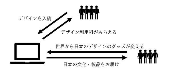 プロジェクトの一部として全国にいるフリーランスのデザイナーが自分の作ったデザインでグッズを販売できる仕組みを取り入れ、ただ販売を目的としたわけでなく、人と人をつなぎ、誰でも日本から世界へ物の販売が実現させます。