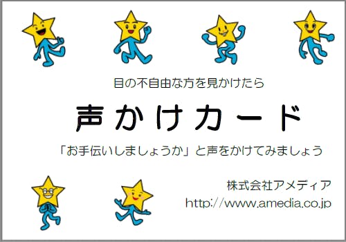 ご支援頂いた皆様には、アメディアオリジナルの「目の不自由な方への声かけカード」をメールまたは郵便でもれなくお送りさせて頂きます。
