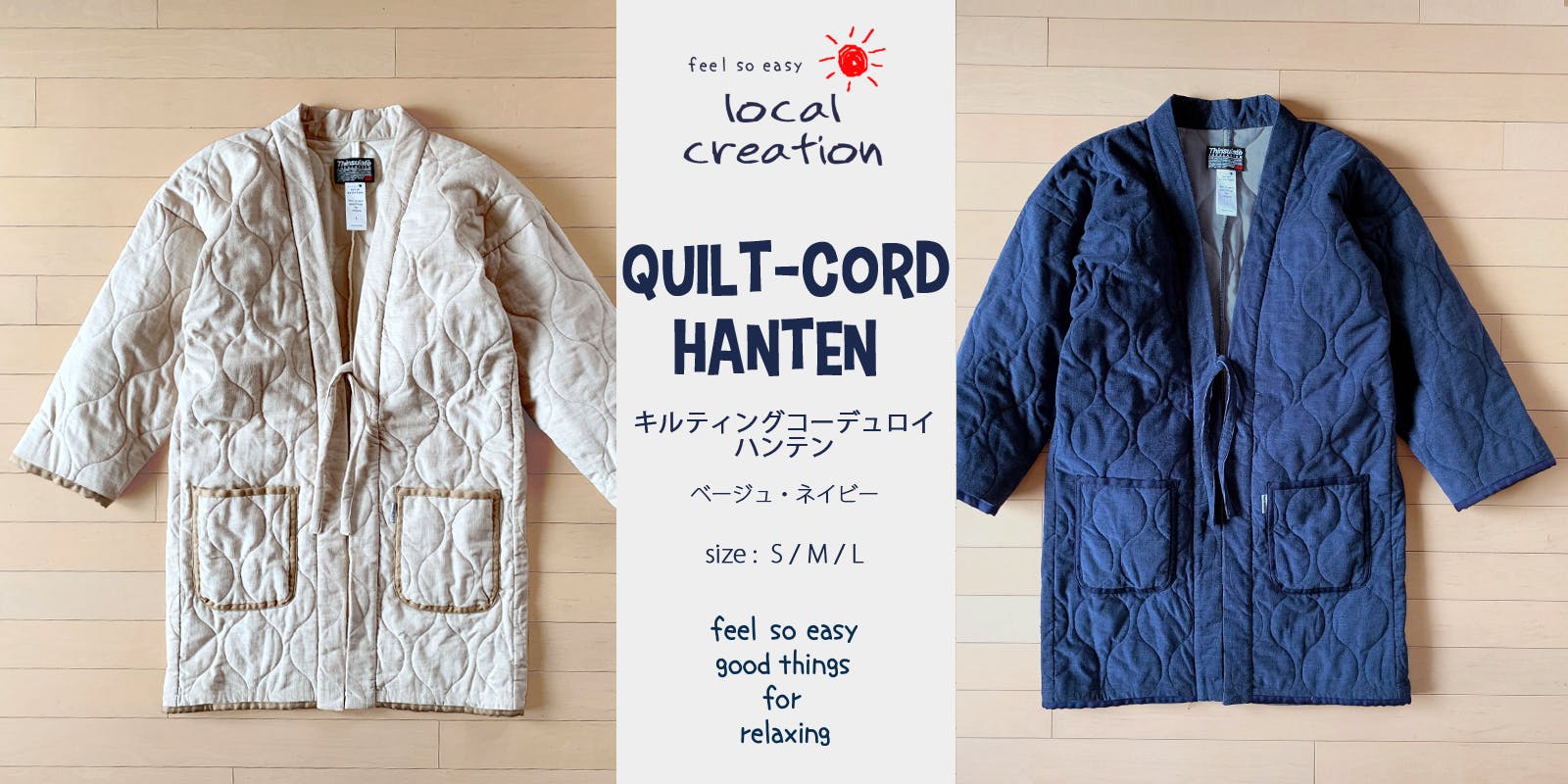 昔ながらの「綿入り半纏」のその特徴的なスタイルを引き継ぎつつ、袖丈、着丈を少し長めに調整、素材は綿100%にこだわり、さわりごこちの良いコーデュロイ素材をキルティングしてアウターウエアとしてアップデートした「ハンテン」をつくりました。