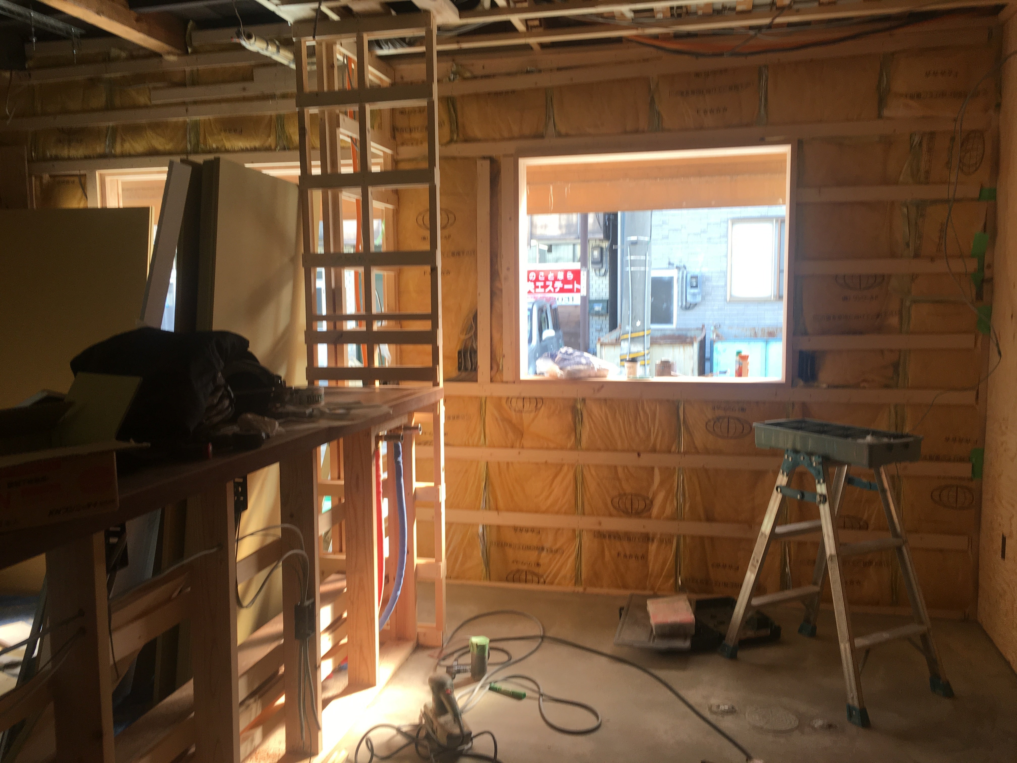 さて、お店の工事も順調に進んでいます。写真は厨房から瀬羽町通りに向かって撮ったものです。