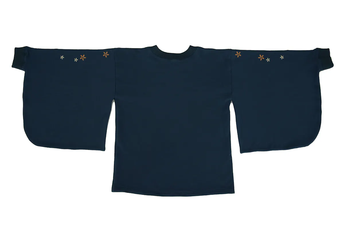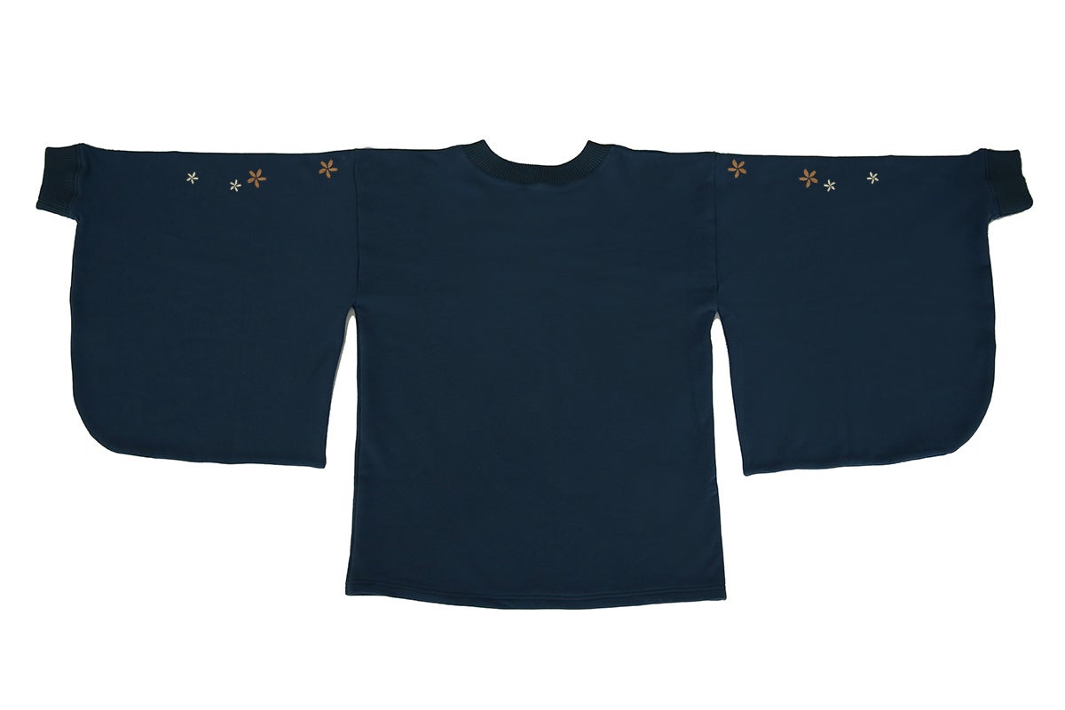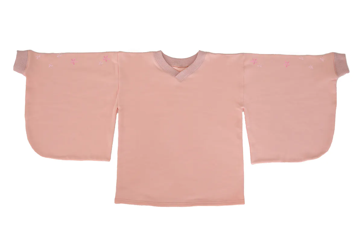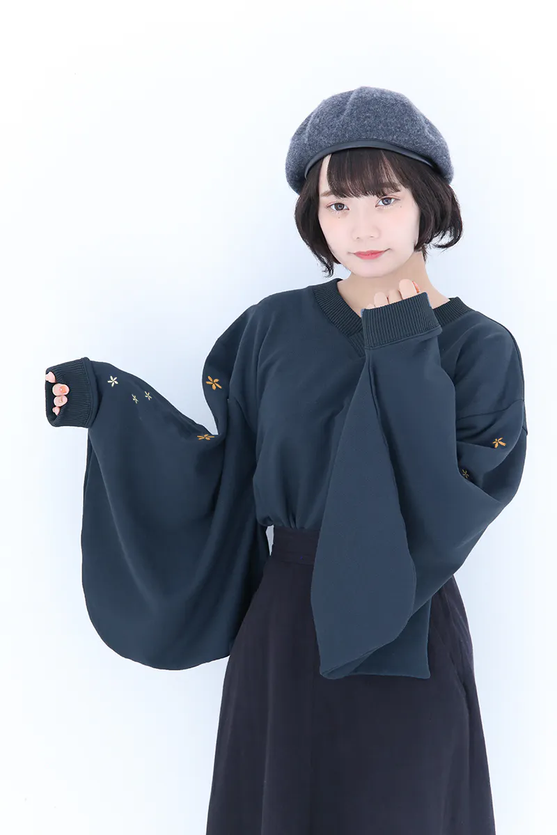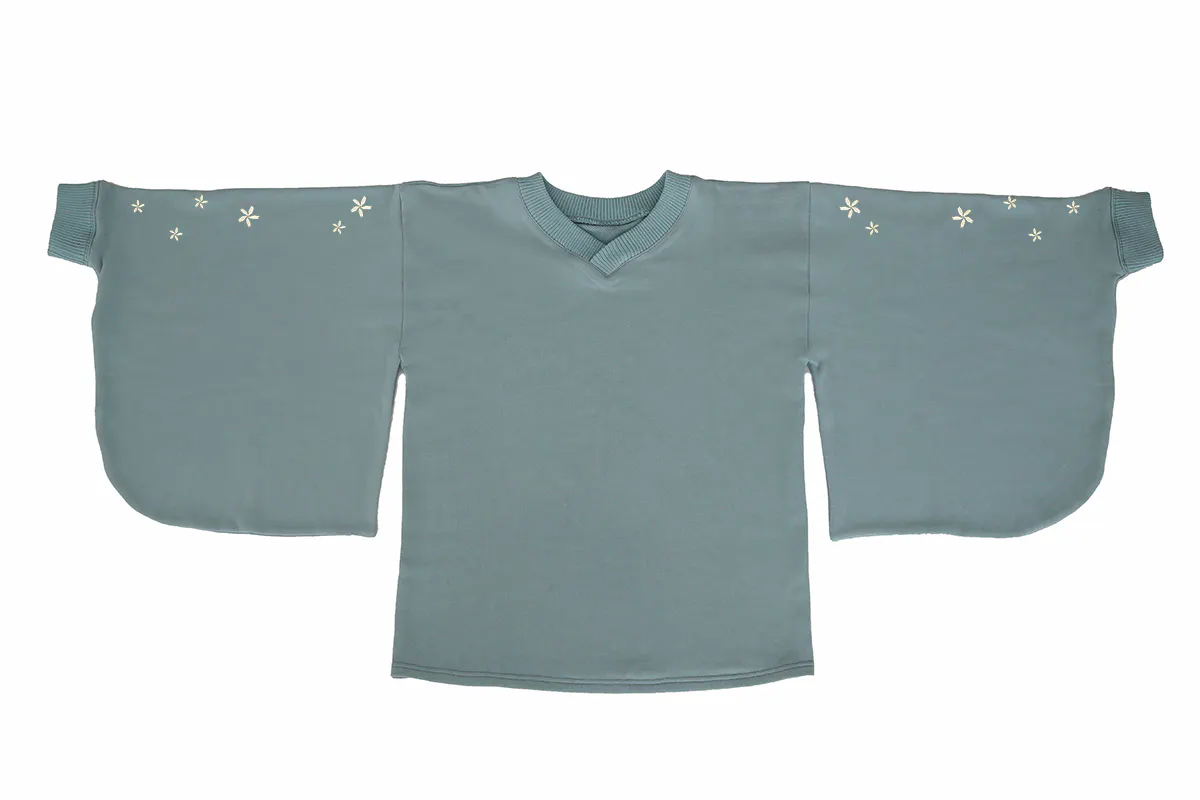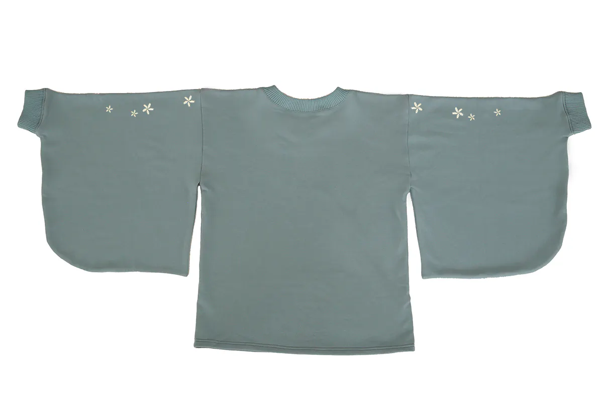 和風をさりげなく楽しめるよう、スウェット生地ながら振袖の仕様を取り入れています。