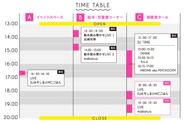 無料で楽しめるコンテンツから、最後は出演アーティストのLIVEパフォーマンス(有料:小学生以下、無料)まで自由に楽しめる時間となっています。